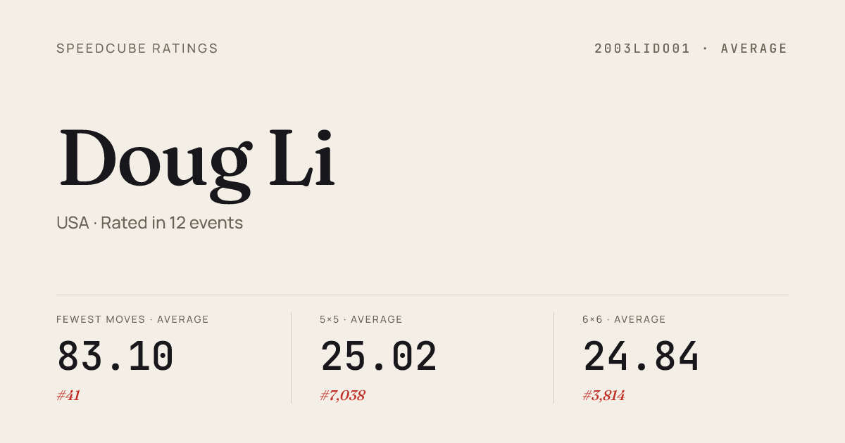 Sep 20, 20253x3x3 Cube · Round 1WashtenawSlowFall2025 · 68th25.71Sep 20, 20253x3x3 One-Handed · Round 1WashtenawSlowFall2025 · 45th52.56Sep 20, 20254x4x4 Cube · Combined FinalWashtenawSlowFall2025 · 50th1:28.50Sep 20, 20255x5x5 Cube · Round 1WashtenawSlowFall2025 · 35th2:12.29Sep 20, 20256x6x6 Cube · Combined FinalWashtenawSlowFall2025 · 32nd4:30.70Sep 20, 20257x7x7 Cube · Combined FinalWashtenawSlowFall2025 · 26th6:59.00Sep 20, 2025Megaminx · Round 1WashtenawSlowFall2025 · 43rd2:59.44Aug 3, 20252x2x2 Cube · Round 1GreatLakesChampionship2025 · 195th9.31Aug 3, 20253x3x3 Cube · Round 1GreatLakesChampionship2025 · 197th24.83Aug 3, 20253x3x3 Fewest Moves · FinalGreatLakesChampionship2025 · 5th24.67Aug 3, 20254x4x4 Cube · Round 1GreatLakesChampionship2025 · 143rd1:22.77Aug 3, 20255x5x5 Cube · Round 1GreatLakesChampionship2025 · 111th2:10.32Aug 3, 20256x6x6 Cube · Round 1GreatLakesChampionship2025 · 82nd4:02.96Aug 3, 20257x7x7 Cube · Round 1GreatLakesChampionship2025 · 82nd6:55.82Aug 3, 2025Clock · Round 1GreatLakesChampionship2025 · 163rd30.02Aug 3, 2025Pyraminx · Round 1GreatLakesChampionship2025 · 193rd19.02Aug 3, 2025Skewb · Round 1GreatLakesChampionship2025 · 180th21.43Jul 6, 20252x2x2 Cube · Round 1WC2025 · world · 1538th8.66Jul 6, 20253x3x3 Cube · Round 1WC2025 · world · 1727th22.44