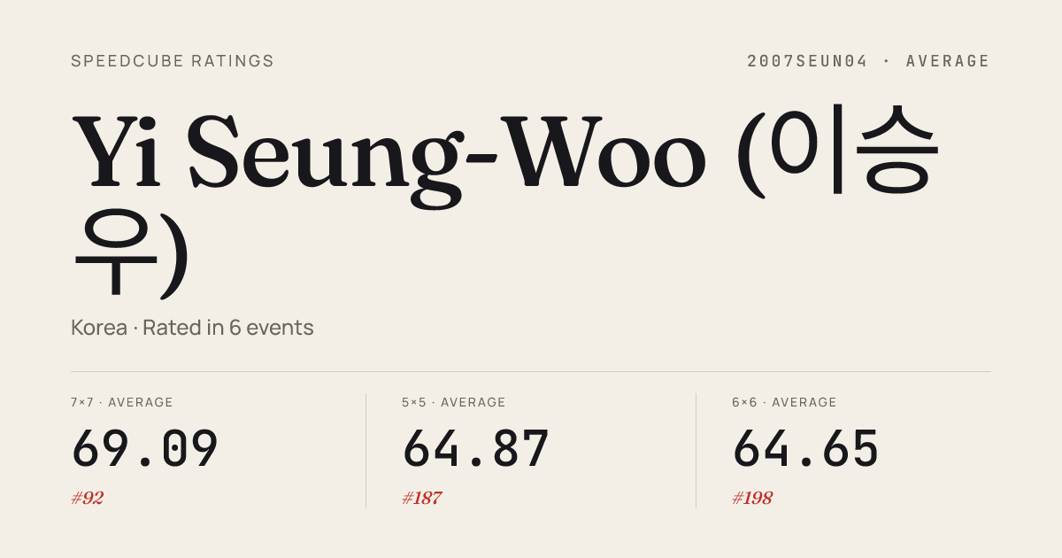 Feb 7, 2026Square-1 · Combined FinalAnsanFavorites2026 · 7th17.20Jan 18, 20263x3x3 Cube · Semi-FinalSeoulWinter2026 · 41st10.34Jan 18, 20263x3x3 Cube · Round 2SeoulWinter2026 · 38th10.13Jan 18, 20263x3x3 Cube · Round 1SeoulWinter2026 · 68th12.15Jan 18, 20263x3x3 Blindfolded · Round 1SeoulWinter2026 · 17th1:52.08Jan 18, 20265x5x5 Cube · Round 1SeoulWinter2026 · 4th51.58Jan 18, 20265x5x5 Cube · FinalSeoulWinter2026 · 9th56.39Jan 18, 20266x6x6 Cube · Round 1SeoulWinter2026 · 14th2:01.12Jan 18, 20267x7x7 Cube · Round 1SeoulWinter2026 · 4th2:23.90Jan 18, 20267x7x7 Cube · FinalSeoulWinter2026 · 5th2:17.48Dec 28, 20255x5x5 Cube · FinalKoreanChampionship2025 · national · 9th53.55Dec 28, 20255x5x5 Cube · Round 1KoreanChampionship2025 · national · 10th54.73Dec 28, 20256x6x6 Cube · FinalKoreanChampionship2025 · national · 6th1:40.19Dec 28, 20256x6x6 Cube · Round 1KoreanChampionship2025 · national · 3rd1:34.70Dec 28, 20257x7x7 Cube · FinalKoreanChampionship2025 · national · 4th2:18.66Dec 28, 20257x7x7 Cube · Round 1KoreanChampionship2025 · national · 4th2:16.97Dec 28, 2025Square-1 · FinalKoreanChampionship2025 · national · 8th13.88Dec 28, 2025Square-1 · Round 1KoreanChampionship2025 · national · 8th12.89Oct 19, 20253x3x3 Cube · Round 2OkcheonAutumnBreeze2025 · 22nd10.36