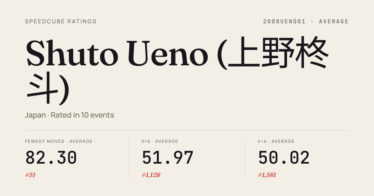 Mar 29, 20263x3x3 Blindfolded · Round 2TokyoBLDSpring2026 · 11th40.61Mar 29, 20263x3x3 Blindfolded · Round 1TokyoBLDSpring2026 · 9th36.01Feb 21, 20263x3x3 Cube · Round 1KantoWinter2026 · 27th10.84Feb 21, 20264x4x4 Cube · Round 1KantoWinter2026 · 16th37.13Jan 25, 20263x3x3 Cube · Round 1OtaWinter2026 · 18th9.63Jan 25, 20263x3x3 One-Handed · Round 1OtaWinter2026 · 9th14.80Jan 25, 20263x3x3 One-Handed · FinalOtaWinter2026 · 10th16.49Jan 25, 20265x5x5 Cube · Round 1OtaWinter2026 · 15th1:06.10Jan 17, 20263x3x3 Fewest Moves · FinalTokyoFMCWinter2026 · 5th23.33Jan 17, 20263x3x3 Fewest Moves · Round 1TokyoFMCWinter2026 · 2nd23.67Dec 13, 20253x3x3 Fewest Moves · FinalKoreanFMCChampionship2025 · national · 5th24.67Dec 13, 20253x3x3 Fewest Moves · Round 1KoreanFMCChampionship2025 · national · 14th22Dec 6, 20253x3x3 Fewest Moves · FinalOtsuFMCWinter2025 · 6th25.00Dec 6, 20253x3x3 Fewest Moves · Round 1OtsuFMCWinter2025 · 5th23.33Nov 8, 20253x3x3 Cube · Round 2OtaAutumn2025 · 15th9.99Nov 8, 20253x3x3 Cube · Round 1OtaAutumn2025 · 19th10.44Nov 8, 20253x3x3 Cube · FinalOtaAutumn2025 · 15th10.12Nov 8, 2025Pyraminx · FinalOtaAutumn2025 · 17th8.38Nov 8, 2025Pyraminx · Round 1OtaAutumn2025 · 18th9.33