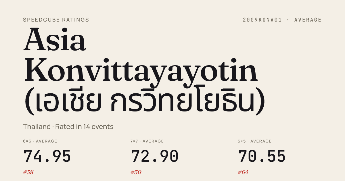 Mar 22, 20263x3x3 Cube · FinalMYHMHaNxNoi2026 · 4th6.70Mar 22, 20263x3x3 Blindfolded · Round 1MYHMHaNxNoi2026 · 11th4:23.54Mar 22, 20263x3x3 One-Handed · FinalMYHMHaNxNoi2026 · 12th15.55Mar 22, 20263x3x3 One-Handed · Round 1MYHMHaNxNoi2026 · 6th14.05Mar 22, 20264x4x4 Cube · Round 1MYHMHaNxNoi2026 · 8th29.01Mar 22, 20264x4x4 Cube · FinalMYHMHaNxNoi2026 · 10th30.17Mar 22, 20265x5x5 Cube · Round 1MYHMHaNxNoi2026 · 7th51.82Mar 22, 20265x5x5 Cube · FinalMYHMHaNxNoi2026 · 7th50.37Mar 22, 20266x6x6 Cube · Round 1MYHMHaNxNoi2026 · 5th1:24.38Mar 22, 20266x6x6 Cube · FinalMYHMHaNxNoi2026 · 6th1:30.38Mar 22, 20267x7x7 Cube · FinalMYHMHaNxNoi2026 · 5th2:18.71Mar 22, 20267x7x7 Cube · Round 1MYHMHaNxNoi2026 · 5th2:19.98Mar 15, 20262x2x2 Cube · FinalParadiseParkBangkokNxNxN2026 · 12th3.05Mar 15, 20262x2x2 Cube · Round 1ParadiseParkBangkokNxNxN2026 · 16th3.45Mar 15, 20263x3x3 Cube · Round 1ParadiseParkBangkokNxNxN2026 · 13th7.80Mar 15, 20263x3x3 Cube · Round 2ParadiseParkBangkokNxNxN2026 · 10th7.45Mar 15, 20263x3x3 Cube · FinalParadiseParkBangkokNxNxN2026 · 12th8.35Mar 15, 20263x3x3 One-Handed · Round 1ParadiseParkBangkokNxNxN2026 · 9th13.34Mar 15, 20263x3x3 One-Handed · FinalParadiseParkBangkokNxNxN2026 · 11th14.04