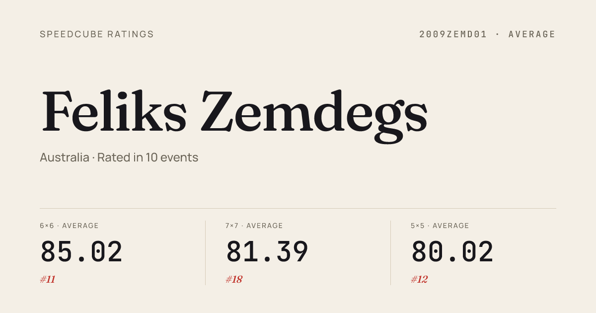 Apr 19, 20263x3x3 Cube · FinalSolvinginSale2026 · 3rd6.74Apr 19, 20263x3x3 One-Handed · Combined FinalSolvinginSale2026 · 5th12.02Apr 19, 20264x4x4 Cube · Combined FinalSolvinginSale2026 · 1st24.45Apr 19, 20265x5x5 Cube · Combined FinalSolvinginSale2026 · 1st43.48Apr 19, 2026Megaminx · Combined FinalSolvinginSale2026 · 2nd41.14Apr 19, 2026Skewb · Round 1SolvinginSale2026 · 39th10.19Feb 8, 20262x2x2 Cube · Round 1DontInverlochUp2026 · 6th2.01Feb 8, 20262x2x2 Cube · FinalDontInverlochUp2026 · 11th3.14Feb 8, 20262x2x2 Cube · Round 2DontInverlochUp2026 · 10th2.65Feb 8, 20263x3x3 Cube · FinalDontInverlochUp2026 · 1st6.76Feb 8, 20263x3x3 Cube · Round 1DontInverlochUp2026 · 1st6.45Feb 8, 20263x3x3 Cube · Round 2DontInverlochUp2026 · 4th8.20Feb 8, 20264x4x4 Cube · FinalDontInverlochUp2026 · 1st23.44Feb 8, 20264x4x4 Cube · Round 1DontInverlochUp2026 · 1st23.83Feb 8, 20265x5x5 Cube · Combined FinalDontInverlochUp2026 · 1st41.80Feb 8, 2026Megaminx · Combined FinalDontInverlochUp2026 · 3rd38.67Jan 26, 20262x2x2 Cube · FinalMelbourneSummer2026 · 20th3.23Jan 26, 20262x2x2 Cube · Round 1MelbourneSummer2026 · 24th2.42Jan 26, 20262x2x2 Cube · Round 2MelbourneSummer2026 · 20th2.32
