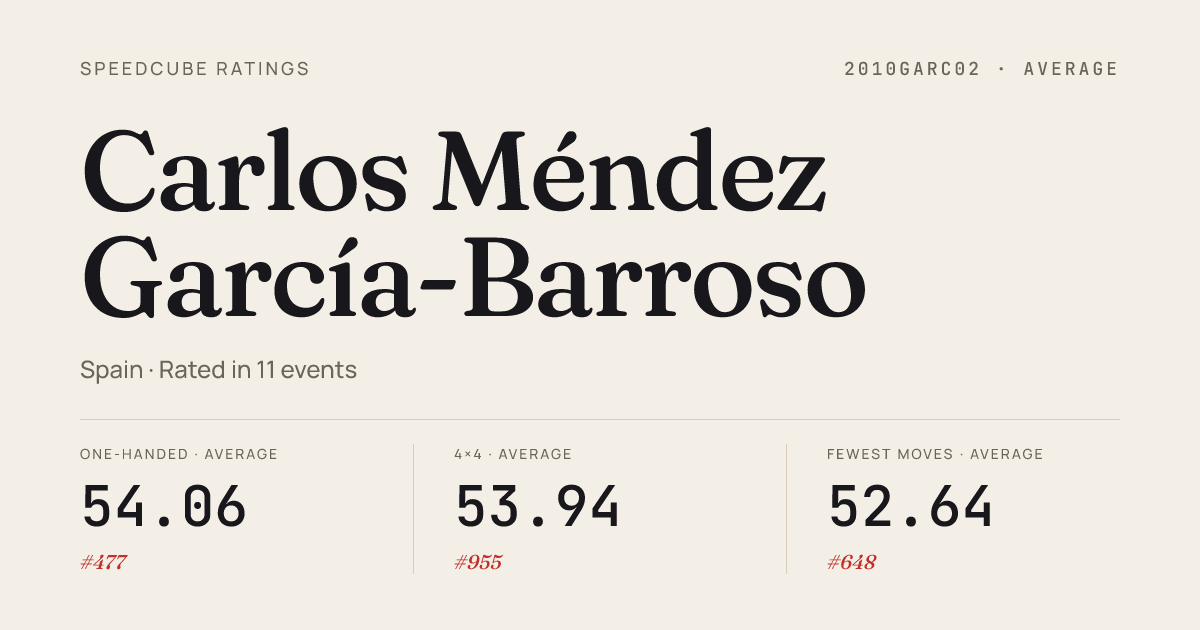 Apr 12, 20263x3x3 Cube · Round 2MairenaOpen2026 · 3rd8.97Apr 12, 20263x3x3 One-Handed · Combined FinalMairenaOpen2026 · 1st14.21Apr 12, 20264x4x4 Cube · Round 1MairenaOpen2026 · 3rd33.88Apr 12, 20264x4x4 Cube · FinalMairenaOpen2026 · 4th33.50Apr 12, 2026Clock · FinalMairenaOpen2026 · 4th7.61Apr 12, 2026Clock · Round 1MairenaOpen2026 · 8th8.86Apr 12, 2026Skewb · FinalMairenaOpen2026 · 1st2.35Apr 12, 2026Skewb · Round 1MairenaOpen2026 · 3rd3.86Apr 12, 2026Skewb · Round 2MairenaOpen2026 · 1st2.72Mar 22, 20262x2x2 Cube · FinalFuentesdeAndaluciaOpen2026 · 3rd1.88Mar 22, 20262x2x2 Cube · Round 2FuentesdeAndaluciaOpen2026 · 2nd2.02Mar 22, 20262x2x2 Cube · Round 1FuentesdeAndaluciaOpen2026 · 5th2.82Mar 22, 20263x3x3 Cube · Round 2FuentesdeAndaluciaOpen2026 · 1st7.99Mar 22, 20263x3x3 Cube · Round 1FuentesdeAndaluciaOpen2026 · 1st7.66Mar 22, 20263x3x3 Cube · FinalFuentesdeAndaluciaOpen2026 · 1st7.73Mar 22, 20263x3x3 One-Handed · Round 1FuentesdeAndaluciaOpen2026 · 1st14.14Mar 22, 20263x3x3 One-Handed · FinalFuentesdeAndaluciaOpen2026 · 1st13.68Mar 22, 20264x4x4 Cube · Round 1FuentesdeAndaluciaOpen2026 · 3rd35.02Mar 22, 20264x4x4 Cube · FinalFuentesdeAndaluciaOpen2026 · 4th35.91