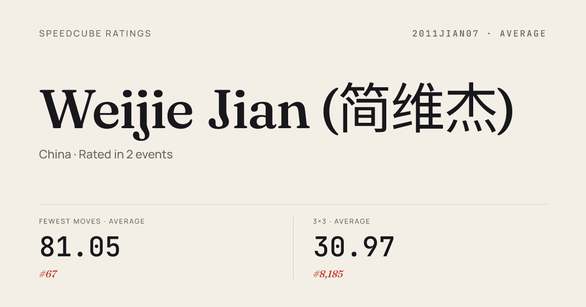 - Mar 22, 20263x3x3 Fewest Moves · Round 1FMCantonHaizhu2026 · 42nd20