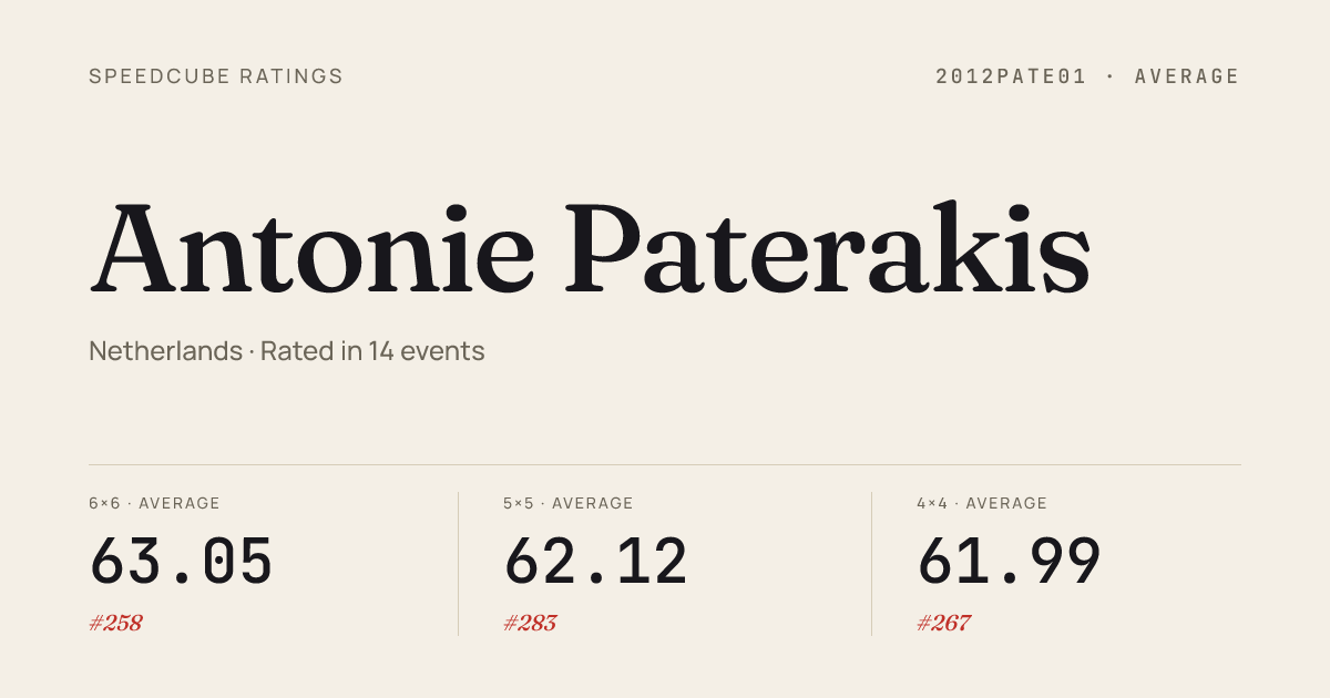 Dec 21, 20254x4x4 Cube · Combined FinalFreezingFryslan2025 · 2nd30.00Dec 20, 20253x3x3 Cube · Round 2CubinginOudIJsselmuiden2025 · 4th7.37Dec 20, 20253x3x3 Cube · Round 1CubinginOudIJsselmuiden2025 · 14th9.62Dec 20, 20253x3x3 Cube · FinalCubinginOudIJsselmuiden2025 · 4th6.87Dec 20, 20255x5x5 Cube · Round 1CubinginOudIJsselmuiden2025 · 4th53.82Dec 20, 20255x5x5 Cube · FinalCubinginOudIJsselmuiden2025 · 5th54.97Dec 20, 2025Megaminx · Combined FinalCubinginOudIJsselmuiden2025 · 5th53.34Dec 6, 20253x3x3 Cube · Round 1PakjeOpeninLent2025 · 7th8.09Dec 6, 20253x3x3 Cube · Round 2PakjeOpeninLent2025 · 5th7.39Dec 6, 20253x3x3 Cube · FinalPakjeOpeninLent2025 · 2nd6.50Dec 6, 20253x3x3 One-Handed · FinalPakjeOpeninLent2025 · 5th12.73Dec 6, 20254x4x4 Cube · Round 1PakjeOpeninLent2025 · 6th29.25Dec 6, 20254x4x4 Cube · FinalPakjeOpeninLent2025 · 4th28.22Dec 6, 20255x5x5 Cube · Combined FinalPakjeOpeninLent2025 · 3rd55.92Nov 23, 20252x2x2 Cube · FinalBelgianNationals2025 · national · 3rd1.58Nov 23, 20252x2x2 Cube · Round 1BelgianNationals2025 · national · 1st1.25Nov 23, 20253x3x3 Cube · Round 1BelgianNationals2025 · national · 3rd7.32Nov 23, 20253x3x3 Cube · FinalBelgianNationals2025 · national · 2nd6.64Nov 23, 20253x3x3 Cube · Round 2BelgianNationals2025 · national · 3rd6.91