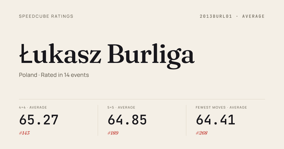 Apr 12, 20263x3x3 Cube · Round 2MielecCubingDays2026 · 4th7.03Apr 12, 20263x3x3 One-Handed · FinalMielecCubingDays2026 · 6th14.28Apr 12, 20263x3x3 One-Handed · Round 2MielecCubingDays2026 · 6th13.99Apr 12, 20263x3x3 One-Handed · Round 1MielecCubingDays2026 · 5th12.92Apr 12, 20264x4x4 Cube · FinalMielecCubingDays2026 · 5th28.96Apr 12, 20264x4x4 Cube · Round 1MielecCubingDays2026 · 2nd27.58Apr 12, 20265x5x5 Cube · FinalMielecCubingDays2026 · 2nd50.93Apr 12, 20265x5x5 Cube · Round 1MielecCubingDays2026 · 4th53.07Apr 12, 2026Clock · Round 1MielecCubingDays2026 · 18th9.05Apr 12, 2026Megaminx · FinalMielecCubingDays2026 · 7th45.35Apr 12, 2026Megaminx · Round 1MielecCubingDays2026 · 9th49.33Apr 12, 2026Megaminx · Round 2MielecCubingDays2026 · 9th47.32Apr 12, 2026Pyraminx · Round 1MielecCubingDays2026 · 13th4.31Apr 12, 2026Skewb · Round 1MielecCubingDays2026 · 3rd2.91Apr 12, 2026Skewb · Round 2MielecCubingDays2026 · 5th2.53Apr 12, 2026Skewb · FinalMielecCubingDays2026 · 5th2.64Apr 12, 2026Square-1 · Combined FinalMielecCubingDays2026 · 17th23.41Mar 21, 20262x2x2 Cube · Round 1Cube4funinNowaSarzyna2026 · 6th2.41Mar 21, 20262x2x2 Cube · FinalCube4funinNowaSarzyna2026 · 7th3.20