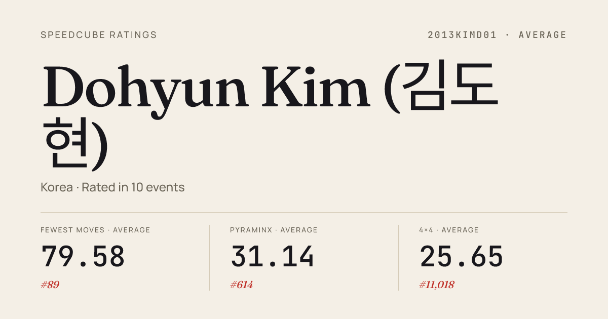 Dec 28, 2025Skewb · Round 1KoreanChampionship2025 · national · 35th7.58Dec 13, 20253x3x3 Fewest Moves · Round 1KoreanFMCChampionship2025 · national · 2nd24.00Dec 13, 20253x3x3 Fewest Moves · FinalKoreanFMCChampionship2025 · national · 6th25.33Aug 24, 20253x3x3 Fewest Moves · Round 1SilentKoreaOpen2025 · 22nd22Aug 24, 20253x3x3 Fewest Moves · FinalSilentKoreaOpen2025 · 16th25Jul 27, 20253x3x3 Fewest Moves · FinalFMCAsia2025 · 22nd26.67Mar 8, 20253x3x3 Cube · Round 1KoreaNewcomersAM2025 · 32nd13.18Mar 8, 2025Pyraminx · FinalKoreaNewcomersAM2025 · 5th3.48Mar 2, 20253x3x3 Fewest Moves · Round 1FMCBusan2025 · 7th25.67Mar 2, 20253x3x3 Fewest Moves · FinalFMCBusan2025 · 6th28.00Dec 28, 20243x3x3 Fewest Moves · FinalSilentKoreaWinter2024 · 5th26.00Oct 27, 20242x2x2 Cube · Round 1DaeguAutumn2024 · 60th5.41Oct 27, 2024Pyraminx · FinalDaeguAutumn2024 · 7th3.68Oct 27, 2024Pyraminx · Round 1DaeguAutumn2024 · 3rd2.37Oct 27, 2024Skewb · Round 1DaeguAutumn2024 · 14th5.98Aug 24, 20243x3x3 Fewest Moves · FinalKoreanFMCChampionship2024 · national · 4th23.67Aug 24, 20243x3x3 Fewest Moves · Round 1KoreanFMCChampionship2024 · national · 4th26.33Aug 17, 20243x3x3 One-Handed · Round 1KoreanChampionship2024 · national · 58th31.94Aug 17, 20244x4x4 Cube · Round 1KoreanChampionship2024 · national · 66th56.10Aug 17, 20245x5x5 Cube · Round 1KoreanChampionship2024 · national · 75th1:59.28