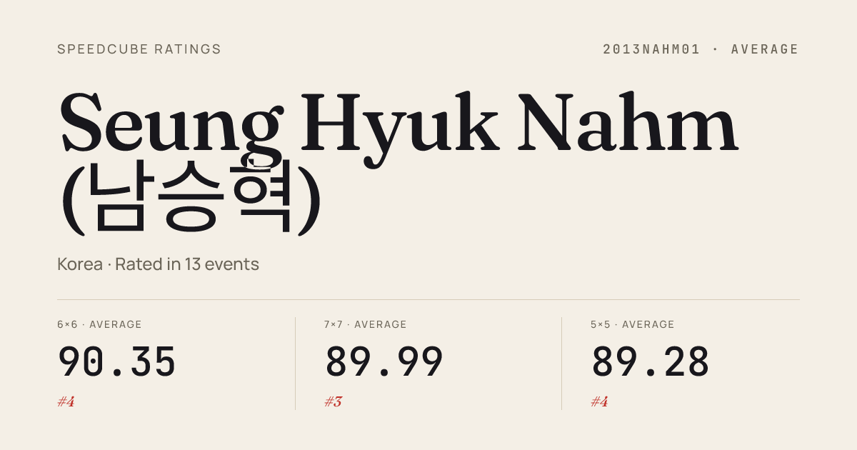 Mar 22, 20264x4x4 Cube · Round 1KatanoSpring2026 · 1st24.12Mar 22, 20265x5x5 Cube · FinalKatanoSpring2026 · 1st38.08Mar 22, 20265x5x5 Cube · Round 1KatanoSpring2026 · 1st37.66Mar 22, 20266x6x6 Cube · Round 1KatanoSpring2026 · 1st1:06.89Mar 22, 20266x6x6 Cube · FinalKatanoSpring2026 · 1st1:10.41Mar 22, 2026Pyraminx · Round 1KatanoSpring2026 · 30th7.40Mar 15, 20262x2x2 Cube · Round 1ParadiseParkBangkokNxNxN2026 · 2nd2.16Mar 15, 20262x2x2 Cube · FinalParadiseParkBangkokNxNxN2026 · 3rd1.99Mar 15, 20263x3x3 Cube · Round 2ParadiseParkBangkokNxNxN2026 · 1st6.28Mar 15, 20263x3x3 Cube · Round 1ParadiseParkBangkokNxNxN2026 · 1st5.55Mar 15, 20263x3x3 Cube · FinalParadiseParkBangkokNxNxN2026 · 2nd6.04Mar 15, 20263x3x3 One-Handed · Round 1ParadiseParkBangkokNxNxN2026 · 3rd11.21Mar 15, 20263x3x3 One-Handed · FinalParadiseParkBangkokNxNxN2026 · 3rd11.02Mar 15, 20264x4x4 Cube · Round 1ParadiseParkBangkokNxNxN2026 · 1st22.50Mar 15, 20264x4x4 Cube · Round 2ParadiseParkBangkokNxNxN2026 · 2nd22.77Mar 15, 20264x4x4 Cube · FinalParadiseParkBangkokNxNxN2026 · 2nd24.45Mar 15, 20265x5x5 Cube · Round 1ParadiseParkBangkokNxNxN2026 · 1st36.31Mar 15, 20265x5x5 Cube · FinalParadiseParkBangkokNxNxN2026 · 1st38.03Mar 15, 20265x5x5 Cube · Round 2ParadiseParkBangkokNxNxN2026 · 2nd38.77