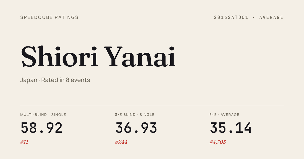 Mar 7, 20263x3x3 Multi-Blind · FinalTokyoBLDWinter2026 · 1st36/41 in 59:01Jan 25, 20263x3x3 Cube · Round 1OtaWinter2026 · 57th14.01Jan 25, 20263x3x3 One-Handed · Round 1OtaWinter2026 · 33rd24.72Jan 25, 20265x5x5 Cube · Round 1OtaWinter2026 · 36th1:34.53Jan 25, 2026Clock · Round 1OtaWinter2026 · 49th6.68Dec 14, 20253x3x3 Multi-Blind · FinalTokaiBigCubes2025 · 1st35/36 in 56:09Dec 14, 20255x5x5 Cube · Round 1TokaiBigCubes2025 · 34th1:41.93Dec 14, 20256x6x6 Cube · Round 1TokaiBigCubes2025 · 33rd3:17.28Dec 7, 20252x2x2 Cube · Round 1TokyoWinter2025 · 50th6.09Dec 7, 20253x3x3 Cube · Round 1TokyoWinter2025 · 61st14.92Dec 7, 20254x4x4 Cube · Round 1TokyoWinter2025 · 34th47.85Dec 7, 2025Square-1 · Round 1TokyoWinter2025 · 17th17.36Nov 8, 20253x3x3 Blindfolded · FinalOtaBLDAutumn2025 · 8th33.46Nov 8, 20253x3x3 Blindfolded · Round 1OtaBLDAutumn2025 · 9th38.92Nov 8, 20253x3x3 Multi-Blind · FinalOtaBLDAutumn2025 · 1st32/36 in 58:36Nov 8, 20254x4x4 Blindfolded · FinalOtaBLDAutumn2025 · 5th3:38.10Nov 8, 20255x5x5 Blindfolded · FinalOtaBLDAutumn2025 · 3rd7:22.40Jul 27, 20253x3x3 Fewest Moves · FinalFMCAsia2025 · 133rd44.67Jul 21, 20253x3x3 One-Handed · Round 1TokyoSummer2025 · 47th30.12
