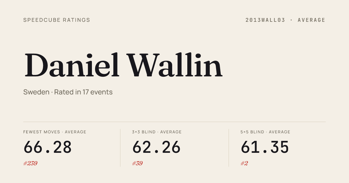 - Apr 19, 20263x3x3 Cube · FinalUgnsbakadFalukorvOpen2026 · 1st7.80