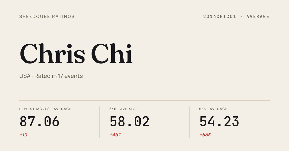 Apr 11, 20266x6x6 Cube · Combined FinalMarbleCityCubingNY2026 · 2nd1:55.77Apr 11, 20267x7x7 Cube · Combined FinalMarbleCityCubingNY2026 · 3rd2:55.03Apr 11, 2026Clock · FinalMarbleCityCubingNY2026 · 8th5.59Apr 11, 2026Clock · Round 1MarbleCityCubingNY2026 · 2nd5.58Apr 11, 2026Megaminx · FinalMarbleCityCubingNY2026 · 5th59.11Apr 11, 2026Megaminx · Round 1MarbleCityCubingNY2026 · 7th57.32Apr 11, 2026Square-1 · Round 1MarbleCityCubingNY2026 · 1st8.97Apr 11, 2026Square-1 · FinalMarbleCityCubingNY2026 · 1st8.47Apr 5, 20263x3x3 One-Handed · Round 1SideEventsinPalisades2026 · 15th15.83Apr 5, 20263x3x3 One-Handed · Round 2SideEventsinPalisades2026 · 13th14.57Apr 5, 20265x5x5 Cube · Round 1SideEventsinPalisades2026 · 12th1:04.60Apr 5, 20265x5x5 Cube · FinalSideEventsinPalisades2026 · 12th1:01.26Apr 5, 20266x6x6 Cube · FinalSideEventsinPalisades2026 · 9th1:51.74Apr 5, 20267x7x7 Cube · FinalSideEventsinPalisades2026 · 6th2:54.88Apr 5, 2026Megaminx · Round 1SideEventsinPalisades2026 · 13th59.12Apr 5, 2026Megaminx · Round 2SideEventsinPalisades2026 · 16th56.36Apr 5, 2026Square-1 · Round 2SideEventsinPalisades2026 · 5th8.40Apr 5, 2026Square-1 · Round 1SideEventsinPalisades2026 · 6th10.15Apr 5, 2026Square-1 · FinalSideEventsinPalisades2026 · 6th9.24