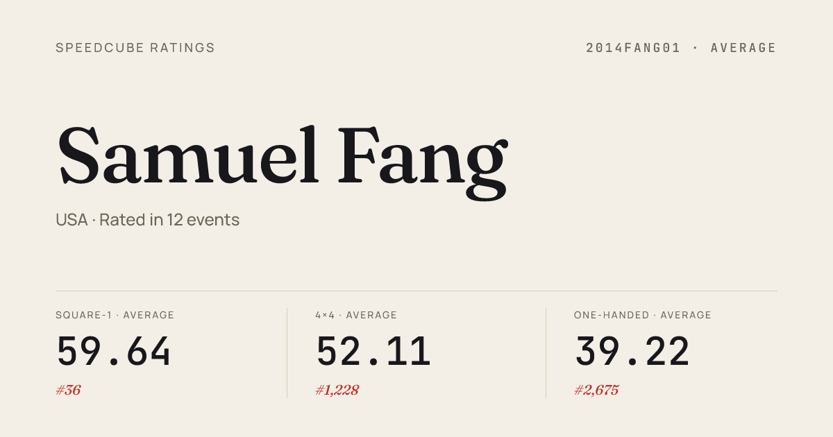 Mar 21, 2026Clock · Round 1ManhattanMegaminxMayhem2026 · 13th8.67Mar 21, 2026Megaminx · Round 1ManhattanMegaminxMayhem2026 · 19th1:26.65Mar 21, 2026Skewb · Round 1ManhattanMegaminxMayhem2026 · 14th7.18Dec 20, 20256x6x6 Cube · Combined FinalManhattanMiniPM2025 · 10th2:55.26Dec 20, 2025Pyraminx · Round 1ManhattanMiniPM2025 · 3rd3.77Dec 20, 2025Square-1 · Round 2ManhattanMiniPM2025 · 2nd6.81Dec 20, 2025Square-1 · Round 1ManhattanMiniPM2025 · 2nd8.45Nov 2, 2025Square-1 · FinalCubingUSAAllStars2025 · national · 6th7.41Jul 6, 20252x2x2 Cube · Round 2WC2025 · world · 198th2.38Jul 6, 20252x2x2 Cube · Round 1WC2025 · world · 154th2.35Jul 6, 20253x3x3 Cube · Round 1WC2025 · world · 338th8.76Jul 6, 20253x3x3 Cube · Round 2WC2025 · world · 516th9.95Jul 6, 20253x3x3 One-Handed · Round 1WC2025 · world · 415th17.57Jul 6, 20254x4x4 Cube · Round 1WC2025 · world · 403rd37.07Jul 6, 20255x5x5 Cube · Round 1WC2025 · world · 574th1:15.90Jul 6, 20256x6x6 Cube · Round 1WC2025 · world · 460th2:37.47Jul 6, 2025Clock · Round 1WC2025 · world · 898th6.44Jul 6, 2025Megaminx · Round 1WC2025 · world · 596th1:14.95Jul 6, 2025Pyraminx · Round 2WC2025 · world · 114th2.97Jul 6, 2025Pyraminx · Round 1WC2025 · world · 134th3.37
