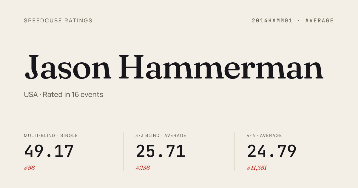 Jan 31, 20264x4x4 Cube · Combined FinalDeNxNver2026 · 40th1:13.83Jan 31, 20265x5x5 Cube · Round 1DeNxNver2026 · 42nd2:25.27Jan 31, 20266x6x6 Cube · FinalDeNxNver2026 · 30th5:10.08Jan 31, 20267x7x7 Cube · FinalDeNxNver2026 · 34th7:19.65Jan 17, 20263x3x3 Blindfolded · FinalRiversidePBQ2026 · 3rd55.46Jan 17, 20263x3x3 Multi-Blind · FinalRiversidePBQ2026 · 2nd30/31 in 57:43Jan 17, 20264x4x4 Blindfolded · FinalRiversidePBQ2026 · 2nd6:13.11Jan 17, 20265x5x5 Blindfolded · FinalRiversidePBQ2026 · 2nd11:17.00Dec 6, 20253x3x3 Cube · Combined Final3x3sin303Colorado2025 · 12th15.65Dec 6, 20253x3x3 Blindfolded · Final3x3sin303Colorado2025 · 2nd53.61Dec 6, 20253x3x3 Multi-Blind · Final3x3sin303Colorado2025 · 1st22/31 in 60:00Dec 6, 20253x3x3 One-Handed · Combined Final3x3sin303Colorado2025 · 10th32.97Nov 22, 20252x2x2 Cube · FinalOrediggerFallCO2025 · 26th5.34Nov 22, 20252x2x2 Cube · Round 1OrediggerFallCO2025 · 26th5.07Nov 22, 20253x3x3 Cube · FinalOrediggerFallCO2025 · 30th15.93Nov 22, 20253x3x3 Cube · Round 1OrediggerFallCO2025 · 29th16.43Nov 22, 20253x3x3 One-Handed · Combined FinalOrediggerFallCO2025 · 29th35.02Nov 22, 20254x4x4 Cube · Combined FinalOrediggerFallCO2025 · 30th1:12.86Nov 22, 2025Pyraminx · Round 1OrediggerFallCO2025 · 43rd13.02