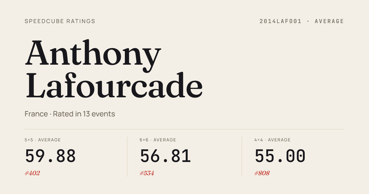 - Apr 6, 20263x3x3 Cube · Round 2FrenchChampionship2026 · national · 41st9.01