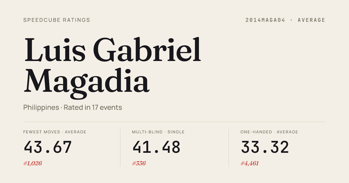 Feb 15, 20266x6x6 Cube · Combined FinalGreenwoodsClockClash2026 · 11th3:46.24Feb 15, 2026Clock · Round 1GreenwoodsClockClash2026 · 14th11.58Feb 15, 2026Clock · Round 2GreenwoodsClockClash2026 · 12th10.44Feb 15, 2026Skewb · Combined FinalGreenwoodsClockClash2026 · 25th11.59Dec 20, 20253x3x3 Cube · Round 1SJDMSpeedcubingOpenIII2025 · 34th15.88Dec 20, 20253x3x3 Blindfolded · FinalSJDMSpeedcubingOpenIII2025 · 3rd50.84Dec 20, 20253x3x3 One-Handed · Combined FinalSJDMSpeedcubingOpenIII2025 · 14th21.59Dec 20, 2025Megaminx · Round 1SJDMSpeedcubingOpenIII2025 · 10th1:53.92Dec 20, 2025Pyraminx · Combined FinalSJDMSpeedcubingOpenIII2025 · 24th13.50Dec 20, 2025Skewb · Round 1SJDMSpeedcubingOpenIII2025 · 20th12.97Dec 20, 2025Square-1 · Combined FinalSJDMSpeedcubingOpenIII2025 · 5th32.95Dec 7, 20253x3x3 Cube · Round 1MarikinaCityReMINXII2025 · 22nd15.24Dec 7, 20253x3x3 One-Handed · Combined FinalMarikinaCityReMINXII2025 · 18th26.05Dec 7, 2025Clock · Round 1MarikinaCityReMINXII2025 · 9th11.06Dec 7, 2025Clock · FinalMarikinaCityReMINXII2025 · 8th9.87Dec 7, 2025Megaminx · Round 1MarikinaCityReMINXII2025 · 17th2:33.83Dec 7, 2025Pyraminx · Round 1MarikinaCityReMINXII2025 · 19th16.11Dec 7, 2025Skewb · Round 1MarikinaCityReMINXII2025 · 18th15.34Nov 30, 20252x2x2 Cube · Combined FinalAlgorithmsinAntipoloIII2025 · 18th5.91Nov 30, 20253x3x3 Blindfolded · FinalAlgorithmsinAntipoloIII2025 · 2nd51.33