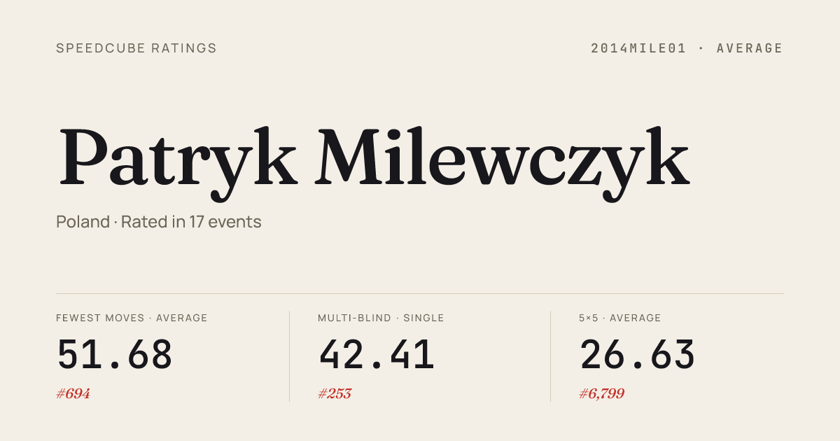 Mar 22, 2026Clock · Round 1GLSGdanskII2026 · 49th21.76Mar 22, 2026Pyraminx · Round 1GLSGdanskII2026 · 64th12.56Mar 22, 2026Skewb · Round 1GLSGdanskII2026 · 59th13.88Feb 8, 20263x3x3 Cube · Round 2GLSBigCubesGdansk2026 · 52nd16.12Feb 8, 20263x3x3 Cube · Round 1GLSBigCubesGdansk2026 · 57th16.98Feb 8, 20264x4x4 Cube · Round 1GLSBigCubesGdansk2026 · 50th1:14.62Feb 8, 20265x5x5 Cube · Round 2GLSBigCubesGdansk2026 · 37th2:13.51Feb 8, 20265x5x5 Cube · Round 1GLSBigCubesGdansk2026 · 39th2:06.36Feb 8, 20266x6x6 Cube · Round 1GLSBigCubesGdansk2026 · 43rd4:59.17Feb 8, 20267x7x7 Cube · Round 1GLSBigCubesGdansk2026 · 37th7:10.74Jan 25, 20262x2x2 Cube · Round 1WinterHolidayCzarnaWoda2026 · 33rd7.79Jan 25, 20263x3x3 Cube · Round 1WinterHolidayCzarnaWoda2026 · 30th17.80Jan 25, 20263x3x3 Cube · Round 2WinterHolidayCzarnaWoda2026 · 30th17.27Jan 25, 20263x3x3 Blindfolded · Round 1WinterHolidayCzarnaWoda2026 · 7th1:01.49Jan 25, 20263x3x3 Blindfolded · FinalWinterHolidayCzarnaWoda2026 · 12th1:38.21Jan 25, 20263x3x3 One-Handed · Round 1WinterHolidayCzarnaWoda2026 · 19th45.51Jan 25, 20264x4x4 Cube · Round 1WinterHolidayCzarnaWoda2026 · 19th1:15.21Jan 25, 20265x5x5 Cube · Round 1WinterHolidayCzarnaWoda2026 · 15th2:04.77Jan 25, 2026Pyraminx · Round 1WinterHolidayCzarnaWoda2026 · 24th12.51