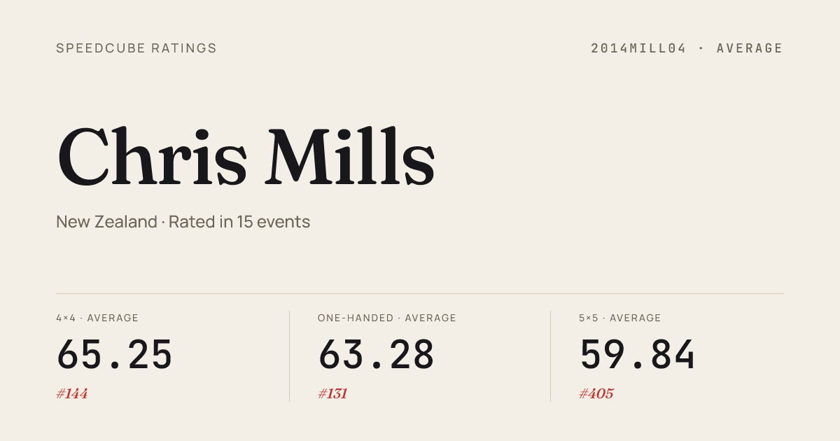 Apr 19, 20263x3x3 Cube · Round 2SolvinginSale2026 · 4th7.02Apr 19, 20263x3x3 Fewest Moves · FinalSolvinginSale2026 · 13th32Apr 19, 20263x3x3 One-Handed · Combined FinalSolvinginSale2026 · 9th14.31Apr 19, 20264x4x4 Cube · Combined FinalSolvinginSale2026 · 6th29.64Apr 19, 20265x5x5 Cube · Combined FinalSolvinginSale2026 · 5th53.54Apr 19, 2026Megaminx · Combined FinalSolvinginSale2026 · 8th48.56Apr 19, 2026Pyraminx · Round 2SolvinginSale2026 · 15th4.28Apr 19, 2026Pyraminx · FinalSolvinginSale2026 · 16th5.06Apr 19, 2026Pyraminx · Round 1SolvinginSale2026 · 10th3.91Apr 19, 2026Skewb · FinalSolvinginSale2026 · 6th3.80Apr 19, 2026Skewb · Round 1SolvinginSale2026 · 5th4.66Feb 8, 20262x2x2 Cube · Round 2GuangdongRevivalRival2026 · 83rd4.11Feb 8, 20262x2x2 Cube · Round 1GuangdongRevivalRival2026 · 22nd2.44Feb 8, 20263x3x3 Cube · Round 1GuangdongRevivalRival2026 · 17th6.85Feb 8, 20263x3x3 Cube · Semi-FinalGuangdongRevivalRival2026 · 32nd7.59Feb 8, 20263x3x3 Cube · Round 2GuangdongRevivalRival2026 · 22nd7.08Feb 8, 20263x3x3 One-Handed · Round 1GuangdongRevivalRival2026 · 13th12.30Feb 8, 20263x3x3 One-Handed · FinalGuangdongRevivalRival2026 · 12th12.98Feb 8, 20264x4x4 Cube · Round 2GuangdongRevivalRival2026 · 17th29.08