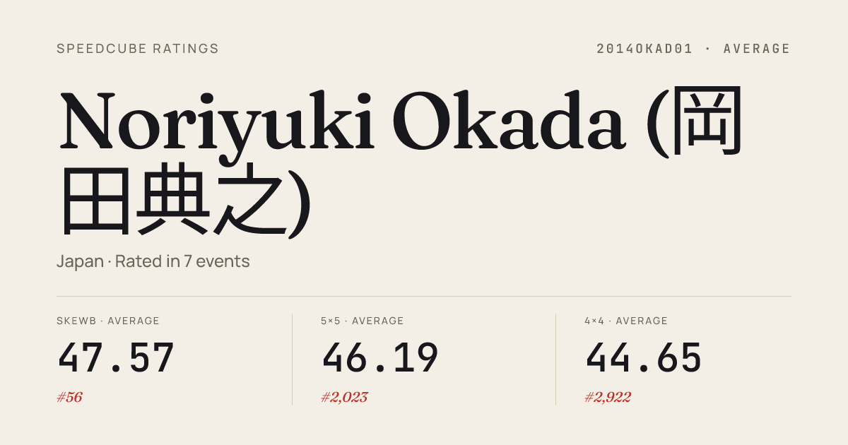 Feb 21, 20263x3x3 Cube · Round 1KantoWinter2026 · 25th10.74Feb 21, 20264x4x4 Cube · Round 1KantoWinter2026 · 29th42.11Feb 21, 2026Skewb · Round 1KantoWinter2026 · 2nd3.07Feb 21, 2026Skewb · FinalKantoWinter2026 · 3rd3.37Dec 28, 20252x2x2 Cube · FinalShimonoseki2025 · 7th4.16Dec 28, 20253x3x3 Cube · Round 1Shimonoseki2025 · 21st11.22Dec 28, 20253x3x3 Blindfolded · FinalShimonoseki2025 · 9th3:13.39Nov 8, 20253x3x3 Cube · FinalOtaAutumn2025 · 17th11.22Nov 8, 20253x3x3 Cube · Round 2OtaAutumn2025 · 18th10.61Nov 8, 20253x3x3 Cube · Round 1OtaAutumn2025 · 22nd11.08Nov 8, 2025Skewb · FinalOtaAutumn2025 · 2nd3.33Nov 8, 2025Skewb · Round 1OtaAutumn2025 · 1st2.71Sep 23, 20256x6x6 Cube · Round 1TokyoAutumn2025 · 35th2:35.47Sep 23, 20257x7x7 Cube · Round 1TokyoAutumn2025 · 38th4:11.97Sep 23, 2025Clock · FinalTokyoAutumn2025 · 5th6.84Sep 23, 2025Clock · Round 1TokyoAutumn2025 · 9th7.09Sep 15, 20252x2x2 Cube · Round 1KatanoSummer2025 · 28th5.07Sep 15, 20253x3x3 Cube · Round 1KatanoSummer2025 · 14th10.32Sep 15, 20253x3x3 Cube · Round 2KatanoSummer2025 · 14th10.66