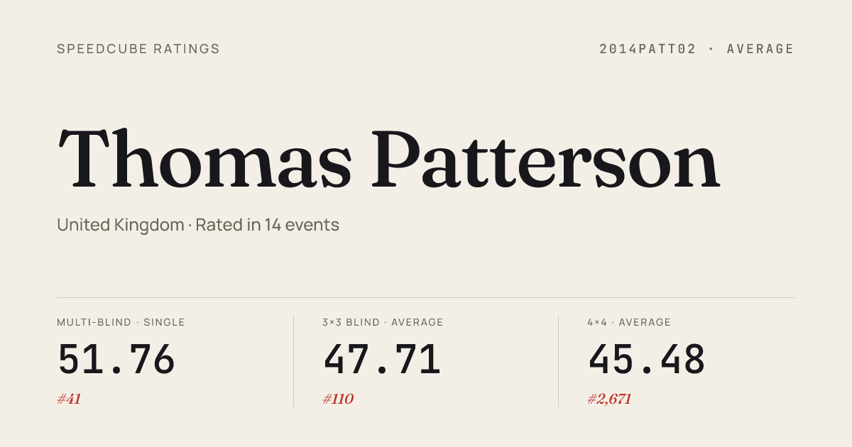 Sep 21, 20253x3x3 Cube · Round 1CorbyAutumn2025 · 13th10.25Sep 21, 20253x3x3 Blindfolded · FinalCorbyAutumn2025 · 1st24.58Sep 21, 20253x3x3 Blindfolded · Round 1CorbyAutumn2025 · 1st24.93Sep 21, 20253x3x3 Multi-Blind · FinalCorbyAutumn2025 · 1st28/33 in 48:05Sep 21, 20253x3x3 One-Handed · Combined FinalCorbyAutumn2025 · 19th23.39Sep 21, 20254x4x4 Cube · FinalCorbyAutumn2025 · 11th39.44Sep 21, 20254x4x4 Cube · Round 1CorbyAutumn2025 · 15th42.01Sep 21, 20255x5x5 Cube · Combined FinalCorbyAutumn2025 · 9th1:16.11Sep 21, 2025Megaminx · Combined FinalCorbyAutumn2025 · 7th54.57Aug 31, 20253x3x3 Cube · Round 2BristolAugust2025 · 3rd9.07Aug 31, 20253x3x3 Cube · FinalBristolAugust2025 · 13th10.53Aug 31, 20253x3x3 Cube · Round 1BristolAugust2025 · 15th10.29Aug 31, 20253x3x3 Blindfolded · Round 1BristolAugust2025 · 1st27.05Aug 31, 20253x3x3 Blindfolded · FinalBristolAugust2025 · 1st24.96Aug 24, 20252x2x2 Cube · Round 1RubiksUKChampionship2025 · national · 156th4.59Aug 24, 20253x3x3 Cube · Round 2RubiksUKChampionship2025 · national · 69th9.75Aug 24, 20253x3x3 Cube · Round 1RubiksUKChampionship2025 · national · 63rd9.71Aug 24, 20253x3x3 Cube · Semi-FinalRubiksUKChampionship2025 · national · 69th10.92Aug 24, 20253x3x3 Blindfolded · FinalRubiksUKChampionship2025 · national · 4th30.60