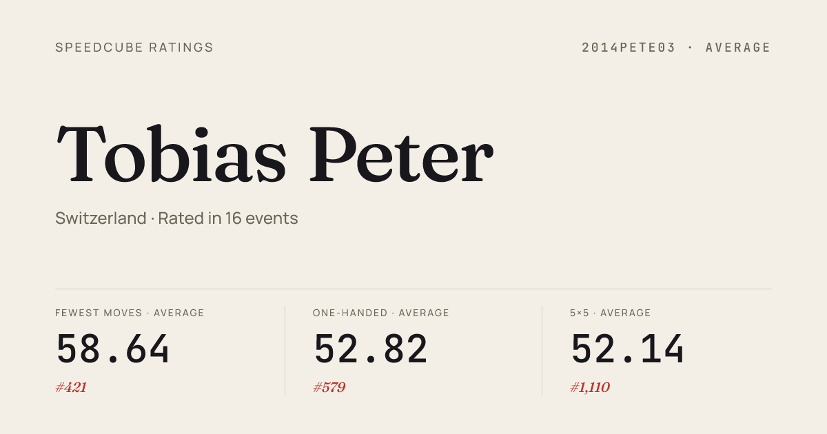 Apr 12, 20265x5x5 Cube · Combined FinalMuriTwistTillItWorks2026 · 7th1:07.35Apr 12, 2026Clock · FinalMuriTwistTillItWorks2026 · 9th8.77Apr 12, 2026Clock · Round 1MuriTwistTillItWorks2026 · 12th9.33Mar 29, 20263x3x3 Cube · FinalWilerWurfelfast2026 · 6th9.95Mar 29, 20263x3x3 Blindfolded · FinalWilerWurfelfast2026 · 1st28.32Mar 29, 20263x3x3 One-Handed · Combined FinalWilerWurfelfast2026 · 4th14.89Mar 29, 20264x4x4 Cube · Combined FinalWilerWurfelfast2026 · 6th36.37Mar 29, 2026Clock · FinalWilerWurfelfast2026 · 7th8.50Mar 29, 2026Megaminx · Combined FinalWilerWurfelfast2026 · 6th58.57Mar 22, 20262x2x2 Cube · FinalSwisscubingCupII2026 · 7th3.15Mar 22, 20262x2x2 Cube · Round 1SwisscubingCupII2026 · 20th4.48Mar 22, 20263x3x3 Cube · Round 1SwisscubingCupII2026 · 16th12.36Mar 22, 20263x3x3 Cube · Round 2SwisscubingCupII2026 · 6th9.60Mar 22, 20263x3x3 Cube · FinalSwisscubingCupII2026 · 12th10.72Mar 22, 20264x4x4 Cube · FinalSwisscubingCupII2026 · 7th35.49Mar 22, 20264x4x4 Cube · Round 1SwisscubingCupII2026 · 7th35.87Feb 28, 20263x3x3 Blindfolded · Round 2BLDBLDBinningen2026 · 9th45.35Feb 28, 20263x3x3 Blindfolded · Round 1BLDBLDBinningen2026 · 4th20.82Feb 28, 20263x3x3 Multi-Blind · FinalBLDBLDBinningen2026 · 16th12/18 in 52:45