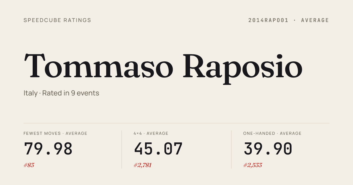 Feb 14, 20264x4x4 Cube · Combined FinalHalaFebruaryKuwait2026 · 2nd40.39Feb 14, 2026Skewb · Combined FinalHalaFebruaryKuwait2026 · 11th12.44Jan 31, 20263x3x3 Fewest Moves · FinalEuropeFMCFriendsWinter2026 · 22nd25.33Jan 31, 20263x3x3 Fewest Moves · Round 1EuropeFMCFriendsWinter2026 · 6th22.33Dec 8, 20252x2x2 Cube · Round 1ItalianChampionship2025 · national · 137th5.69Dec 8, 20253x3x3 Cube · Round 1ItalianChampionship2025 · national · 85th12.00Dec 8, 20253x3x3 Cube · Semi-FinalItalianChampionship2025 · national · 33rd10.09Dec 8, 20253x3x3 Cube · Round 2ItalianChampionship2025 · national · 62nd10.95Dec 8, 20253x3x3 One-Handed · Round 1ItalianChampionship2025 · national · 31st19.09Dec 8, 20254x4x4 Cube · Round 2ItalianChampionship2025 · national · 64th46.82Dec 8, 20254x4x4 Cube · Round 1ItalianChampionship2025 · national · 48th41.58Dec 8, 20255x5x5 Cube · Round 1ItalianChampionship2025 · national · 76th1:34.11Dec 8, 2025Megaminx · Round 1ItalianChampionship2025 · national · 35th1:12.61Dec 8, 2025Skewb · Round 1ItalianChampionship2025 · national · 101st10.58Nov 23, 20253x3x3 Fewest Moves · FinalRubiksFMCItaly2025 · national · 2nd26.33Oct 19, 20252x2x2 Cube · Round 1MuggioICQualifier2025 · 53rd7.99Oct 19, 20253x3x3 Cube · FinalMuggioICQualifier2025 · 7th9.51Oct 19, 20253x3x3 Cube · Round 2MuggioICQualifier2025 · 17th10.85Oct 19, 20253x3x3 Cube · Round 1MuggioICQualifier2025 · 7th9.91