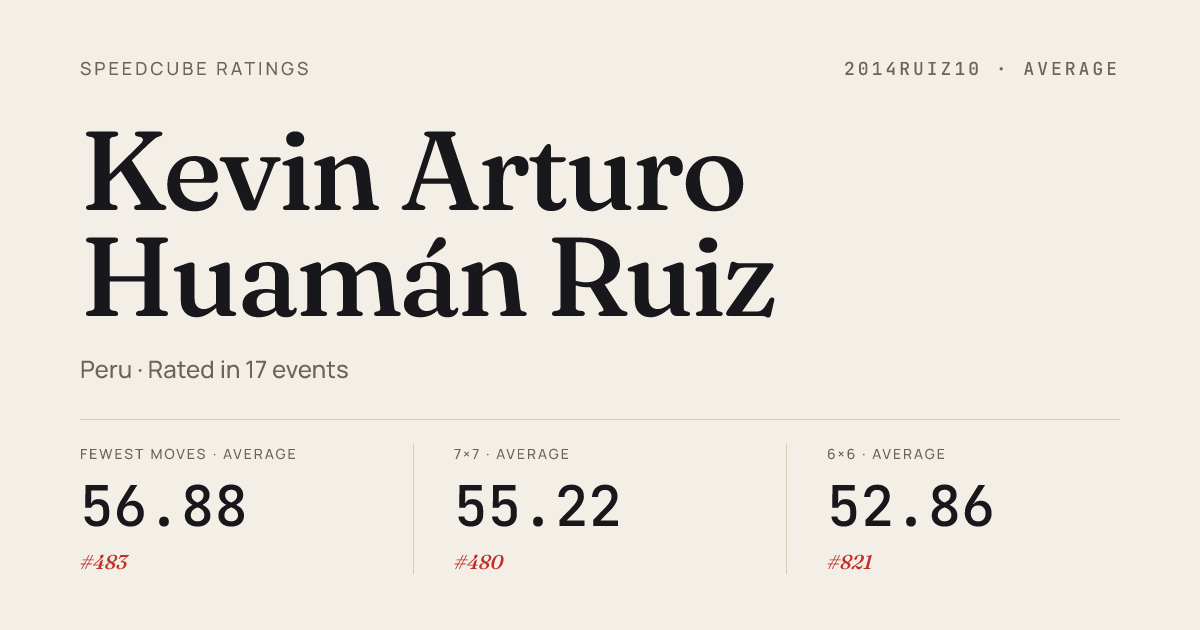 - Mar 22, 20263x3x3 Cube · Semi-FinalPUCPCubingFestivalX2026 · 19th10.52