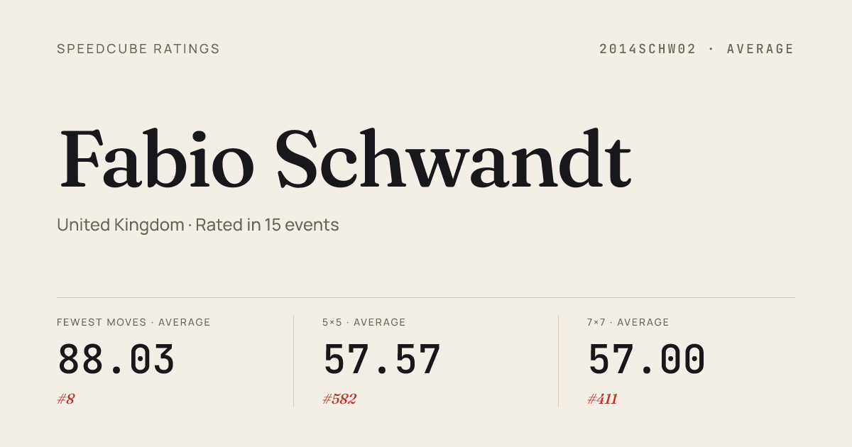 Mar 15, 20265x5x5 Cube · FinalStevenageMarch2026 · 11th1:02.16Mar 15, 2026Clock · Combined FinalStevenageMarch2026 · 59th5.75Mar 15, 2026Pyraminx · Round 1StevenageMarch2026 · 9th3.64Mar 15, 2026Pyraminx · FinalStevenageMarch2026 · 6th3.34Feb 14, 20263x3x3 Fewest Moves · Round 1FMCCheltenhamWinter2026 · 2nd23.00Feb 14, 20263x3x3 Fewest Moves · FinalFMCCheltenhamWinter2026 · 1st20.67Dec 14, 20253x3x3 Cube · Round 2WiltshireWinter2025 · 8th8.22Dec 14, 20253x3x3 Cube · FinalWiltshireWinter2025 · 13th8.43Dec 14, 20253x3x3 Cube · Round 1WiltshireWinter2025 · 14th8.84Dec 14, 20253x3x3 Fewest Moves · FinalWiltshireWinter2025 · 1st24.00Dec 14, 20254x4x4 Cube · Round 1WiltshireWinter2025 · 12th33.73Dec 14, 20254x4x4 Cube · FinalWiltshireWinter2025 · 17th35.15Dec 14, 20255x5x5 Cube · Round 1WiltshireWinter2025 · 14th1:01.74Dec 14, 20255x5x5 Cube · FinalWiltshireWinter2025 · 10th57.19Dec 14, 2025Clock · FinalWiltshireWinter2025 · 12th7.22Dec 14, 2025Clock · Round 1WiltshireWinter2025 · 16th7.13Dec 14, 2025Megaminx · Round 1WiltshireWinter2025 · 13th53.24Dec 14, 2025Megaminx · FinalWiltshireWinter2025 · 12th54.50Dec 14, 2025Square-1 · Combined FinalWiltshireWinter2025 · 6th11.35