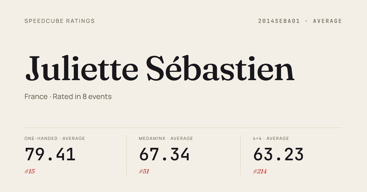 - Apr 6, 20263x3x3 Cube · Round 1FrenchChampionship2026 · national · 6th6.88