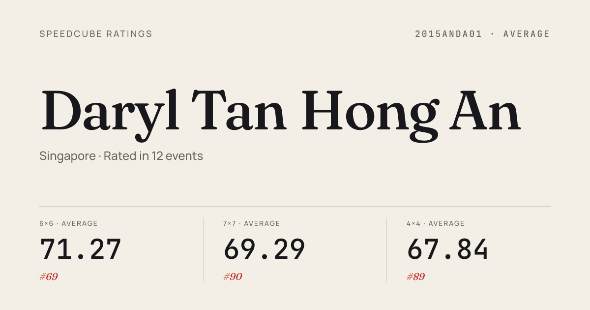 - Feb 22, 20263x3x3 Cube · Semi-FinalSingaporeChampionship2026 · national · 13th7.60