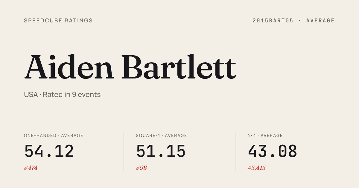 - Apr 18, 20263x3x3 One-Handed · Round 1LakewoodSpring2026 · 3rd13.82