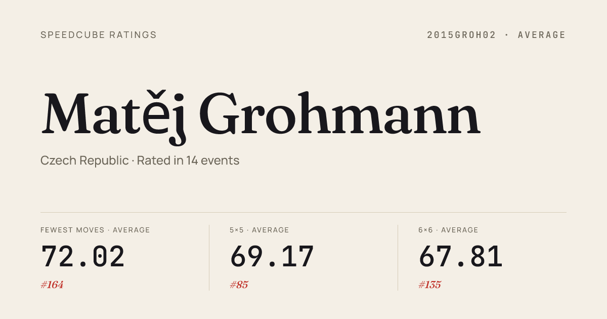 Mar 28, 2026Skewb · Round 1VltavaCubeMarch2026 · 9th6.03Mar 28, 2026Skewb · Round 2VltavaCubeMarch2026 · 8th5.07Mar 8, 20262x2x2 Cube · FinalGluszycaOpen2026 · 5th2.21Mar 8, 20262x2x2 Cube · Round 2GluszycaOpen2026 · 4th2.23Mar 8, 20262x2x2 Cube · Round 1GluszycaOpen2026 · 4th2.42Mar 8, 20263x3x3 Cube · FinalGluszycaOpen2026 · 3rd7.29Mar 8, 20263x3x3 Cube · Round 1GluszycaOpen2026 · 2nd7.21Mar 8, 20263x3x3 Cube · Round 2GluszycaOpen2026 · 6th8.26Mar 8, 20263x3x3 Blindfolded · FinalGluszycaOpen2026 · 12th3:09.88Mar 8, 20263x3x3 One-Handed · Combined FinalGluszycaOpen2026 · 5th14.53Mar 8, 20264x4x4 Cube · FinalGluszycaOpen2026 · 4th29.31Mar 8, 20264x4x4 Cube · Round 1GluszycaOpen2026 · 5th30.48Mar 8, 20265x5x5 Cube · FinalGluszycaOpen2026 · 3rd50.47Mar 8, 20265x5x5 Cube · Round 1GluszycaOpen2026 · 3rd50.94Mar 8, 20266x6x6 Cube · Combined FinalGluszycaOpen2026 · 4th1:36.67Mar 8, 20267x7x7 Cube · Combined FinalGluszycaOpen2026 · 3rd2:20.00Mar 8, 2026Megaminx · Round 1GluszycaOpen2026 · 6th53.00Mar 8, 2026Megaminx · FinalGluszycaOpen2026 · 6th51.66Mar 8, 2026Skewb · FinalGluszycaOpen2026 · 9th4.22