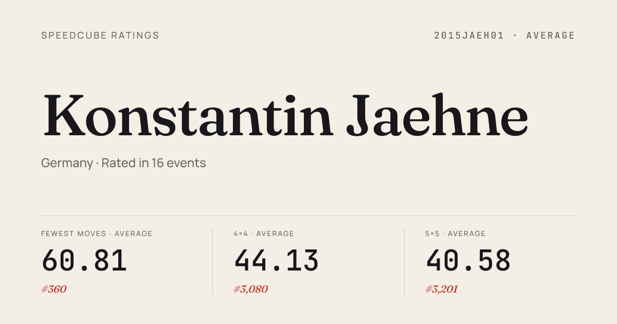 - Apr 6, 20263x3x3 Cube · Round 1FrenchChampionship2026 · national · 144th12.62