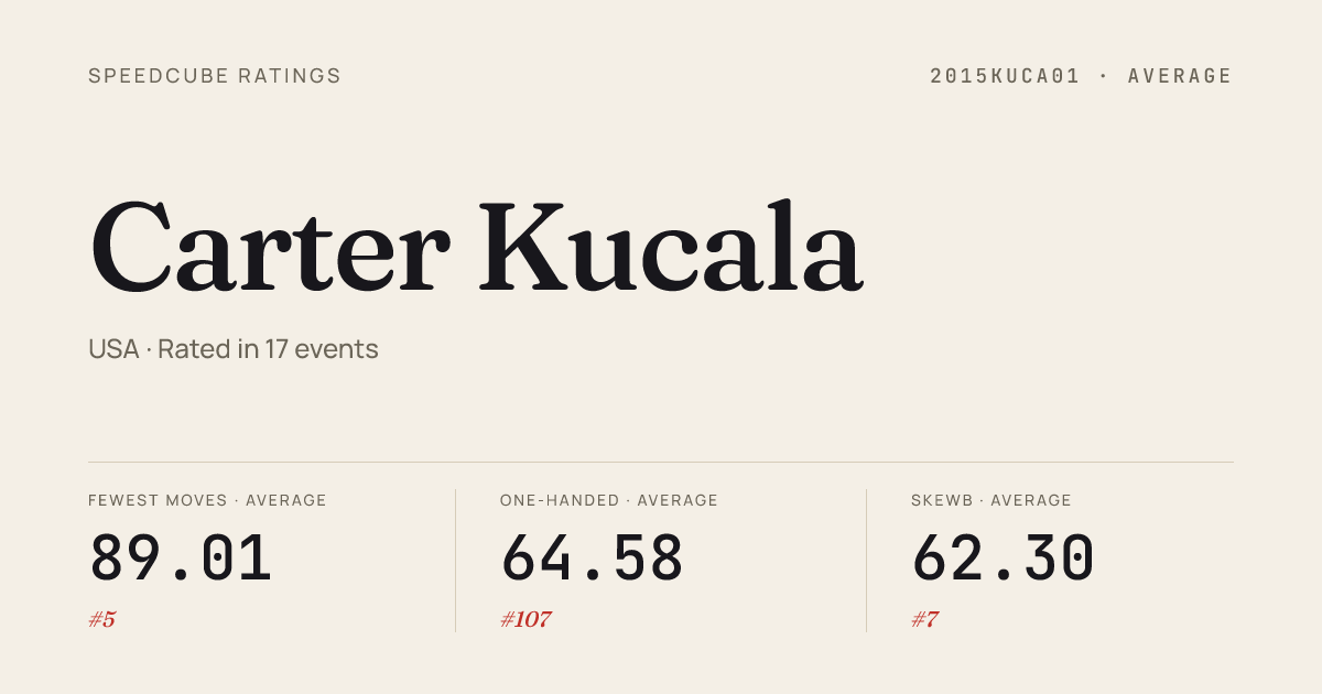Apr 11, 20263x3x3 One-Handed · Round 2CubeAgainstCancerMN2026 · 2nd10.77Apr 11, 20263x3x3 One-Handed · FinalCubeAgainstCancerMN2026 · 3rd12.97Apr 11, 20265x5x5 Cube · Combined FinalCubeAgainstCancerMN2026 · 3rd59.60Apr 11, 2026Skewb · FinalCubeAgainstCancerMN2026 · 1st2.25Apr 11, 2026Skewb · Round 1CubeAgainstCancerMN2026 · 1st2.12Apr 4, 20262x2x2 Cube · Round 2RacineRendezvous2026 · 4th1.84Apr 4, 20262x2x2 Cube · FinalRacineRendezvous2026 · 8th2.60Apr 4, 20262x2x2 Cube · Round 1RacineRendezvous2026 · 7th2.27Apr 4, 20263x3x3 Cube · Round 1RacineRendezvous2026 · 4th7.68Apr 4, 20263x3x3 Cube · Round 2RacineRendezvous2026 · 2nd7.41Apr 4, 20263x3x3 Cube · FinalRacineRendezvous2026 · 4th7.62Apr 4, 2026Megaminx · Round 1RacineRendezvous2026 · 6th51.04Apr 4, 2026Megaminx · FinalRacineRendezvous2026 · 5th54.45Apr 4, 2026Megaminx · Round 2RacineRendezvous2026 · 5th52.28Apr 4, 2026Pyraminx · Round 1RacineRendezvous2026 · 4th3.11Apr 4, 2026Pyraminx · FinalRacineRendezvous2026 · 3rd2.76Apr 4, 2026Skewb · FinalRacineRendezvous2026 · 1st1.78Apr 4, 2026Skewb · Round 1RacineRendezvous2026 · 2nd2.84Mar 21, 20262x2x2 Cube · FinalMachesneyParkSpring2026 · 4th2.13