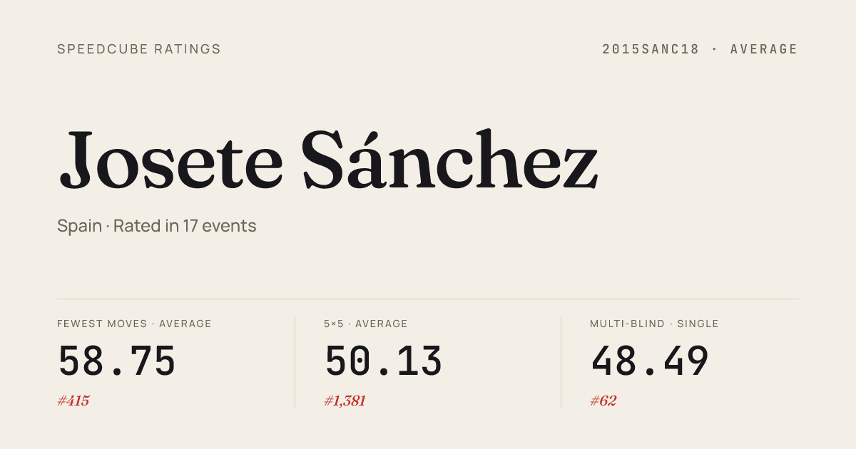 Apr 12, 20263x3x3 Blindfolded · FinalMairenaOpen2026 · 3rd53.99Apr 12, 20264x4x4 Cube · FinalMairenaOpen2026 · 10th40.28Apr 12, 20264x4x4 Cube · Round 1MairenaOpen2026 · 8th39.75Apr 12, 2026Skewb · Round 2MairenaOpen2026 · 10th5.39Apr 12, 2026Skewb · FinalMairenaOpen2026 · 5th4.85Apr 12, 2026Skewb · Round 1MairenaOpen2026 · 10th5.75Mar 29, 20262x2x2 Cube · FinalCervantesCubeaAlcala2026 · 4th2.20Mar 29, 20262x2x2 Cube · Round 2CervantesCubeaAlcala2026 · 7th2.28Mar 29, 20262x2x2 Cube · Round 1CervantesCubeaAlcala2026 · 4th3.11Mar 29, 20263x3x3 Cube · Round 2CervantesCubeaAlcala2026 · 9th10.12Mar 29, 20263x3x3 Cube · FinalCervantesCubeaAlcala2026 · 14th10.90Mar 29, 20263x3x3 Cube · Round 1CervantesCubeaAlcala2026 · 20th11.33Mar 29, 20263x3x3 Blindfolded · FinalCervantesCubeaAlcala2026 · 1st46.38Mar 29, 20263x3x3 Blindfolded · Round 1CervantesCubeaAlcala2026 · 4th41.43Mar 29, 20264x4x4 Cube · Round 1CervantesCubeaAlcala2026 · 9th38.79Mar 29, 20264x4x4 Cube · FinalCervantesCubeaAlcala2026 · 5th35.02Mar 29, 2026Skewb · Round 1CervantesCubeaAlcala2026 · 6th5.03Mar 29, 2026Skewb · FinalCervantesCubeaAlcala2026 · 12th8.28Mar 29, 2026Skewb · Round 2CervantesCubeaAlcala2026 · 7th5.19