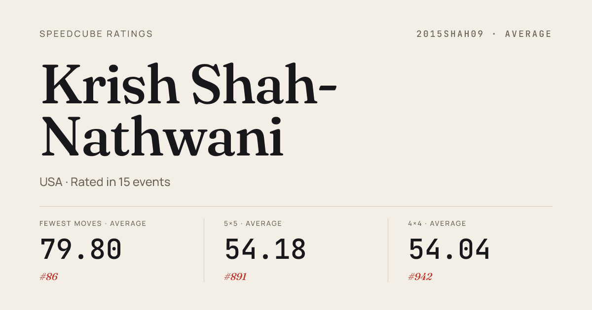 Jan 11, 20263x3x3 Cube · Round 1WrightsvilleBeachBash2026 · 7th8.49Jan 11, 20263x3x3 Cube · FinalWrightsvilleBeachBash2026 · 4th7.48Jan 11, 20263x3x3 Blindfolded · FinalWrightsvilleBeachBash2026 · 3rd1:04.68Jan 11, 20264x4x4 Cube · FinalWrightsvilleBeachBash2026 · 6th32.75Jan 11, 20264x4x4 Cube · Round 1WrightsvilleBeachBash2026 · 9th35.27Jan 11, 20265x5x5 Cube · Combined FinalWrightsvilleBeachBash2026 · 8th1:06.10Jan 11, 2026Skewb · Round 1WrightsvilleBeachBash2026 · 13th5.80Jan 11, 2026Skewb · FinalWrightsvilleBeachBash2026 · 16th6.87Dec 28, 20253x3x3 Blindfolded · FinalNewYorkMultimatePBQIII2025 · 3rd50.11Dec 28, 20253x3x3 Blindfolded · Round 1NewYorkMultimatePBQIII2025 · 8th2:16.65Dec 28, 20253x3x3 Fewest Moves · Round 1NewYorkMultimatePBQIII2025 · 3rd28.00Dec 28, 20253x3x3 Fewest Moves · FinalNewYorkMultimatePBQIII2025 · 3rd22.67Dec 28, 20253x3x3 Multi-Blind · Round 1NewYorkMultimatePBQIII2025 · 8th3/5 in 20:48Dec 28, 20253x3x3 Multi-Blind · FinalNewYorkMultimatePBQIII2025 · 5th3/4 in 15:00Nov 2, 20253x3x3 Cube · Round 1CubingUSAAllStars2025 · national · 25th7.88Nov 2, 20253x3x3 Fewest Moves · FinalCubingUSAAllStars2025 · national · 2nd22.67Sep 20, 20252x2x2 Cube · FinalFitchburgFall2025 · 2nd2.04Sep 20, 20252x2x2 Cube · Round 1FitchburgFall2025 · 3rd2.09Sep 20, 20253x3x3 Cube · Round 1FitchburgFall2025 · 5th8.19