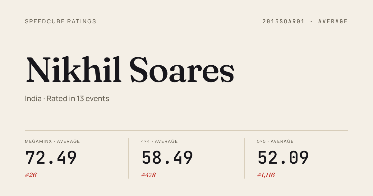Mar 21, 2026Clock · Round 1ManhattanMegaminxMayhem2026 · 17th10.12Mar 21, 2026Megaminx · Round 1ManhattanMegaminxMayhem2026 · 2nd34.05Mar 21, 2026Megaminx · Combined FinalManhattanMegaminxMayhem2026 · 1st31.99Mar 21, 2026Megaminx · Round 2ManhattanMegaminxMayhem2026 · 3rd36.63Mar 21, 2026Skewb · Round 1ManhattanMegaminxMayhem2026 · 7th5.47Mar 21, 2026Skewb · Combined FinalManhattanMegaminxMayhem2026 · 4th3.67Jan 10, 20263x3x3 Cube · Round 2Ottawa3x3x3WinterC2026 · 1st7.55Jan 10, 20263x3x3 Cube · Round 1Ottawa3x3x3WinterC2026 · 1st6.80Jan 10, 20263x3x3 Cube · FinalOttawa3x3x3WinterC2026 · 1st6.97Jan 10, 2026Megaminx · Combined FinalOttawa3x3x3WinterC2026 · 1st31.90Dec 13, 20252x2x2 Cube · Round 1IpswichFall2025 · 7th2.95Dec 13, 20252x2x2 Cube · FinalIpswichFall2025 · 7th3.14Dec 13, 20253x3x3 Cube · Round 2IpswichFall2025 · 1st6.80Dec 13, 20253x3x3 Cube · FinalIpswichFall2025 · 4th8.49Dec 13, 20253x3x3 Cube · Round 1IpswichFall2025 · 1st7.87Dec 13, 20254x4x4 Cube · Combined FinalIpswichFall2025 · 2nd31.58Dec 13, 2025Clock · Round 1IpswichFall2025 · 15th12.52Dec 13, 2025Pyraminx · FinalIpswichFall2025 · 4th3.95Dec 13, 2025Pyraminx · Round 1IpswichFall2025 · 1st3.38Sep 13, 20253x3x3 Blindfolded · Round 1ManhattanMegaminxMayhem22025 · 5th1:05.77