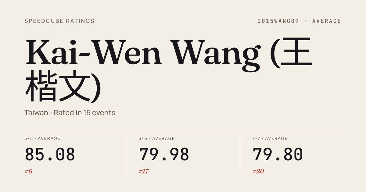 Dec 21, 20253x3x3 Cube · Semi-FinalTaiwanChampionship2025 · 2nd6.63Dec 21, 20253x3x3 Cube · FinalTaiwanChampionship2025 · 2nd6.83Dec 21, 20253x3x3 Blindfolded · FinalTaiwanChampionship2025 · 2nd21.01Dec 21, 20253x3x3 One-Handed · FinalTaiwanChampionship2025 · 1st10.76Dec 21, 20253x3x3 One-Handed · Round 1TaiwanChampionship2025 · 2nd10.47Dec 21, 20254x4x4 Cube · Round 1TaiwanChampionship2025 · 1st22.23Dec 21, 20254x4x4 Cube · Round 2TaiwanChampionship2025 · 1st23.38Dec 21, 20254x4x4 Cube · FinalTaiwanChampionship2025 · 1st21.64Dec 21, 20255x5x5 Cube · Round 2TaiwanChampionship2025 · 1st40.04Dec 21, 20255x5x5 Cube · FinalTaiwanChampionship2025 · 1st37.71Dec 21, 20255x5x5 Cube · Round 1TaiwanChampionship2025 · 1st40.82Dec 21, 20256x6x6 Cube · FinalTaiwanChampionship2025 · 4th1:22.51Dec 21, 20256x6x6 Cube · Round 1TaiwanChampionship2025 · 2nd1:20.52Dec 21, 20257x7x7 Cube · FinalTaiwanChampionship2025 · 4th1:59.06Dec 21, 20257x7x7 Cube · Round 1TaiwanChampionship2025 · 3rd1:57.79Dec 21, 2025Megaminx · FinalTaiwanChampionship2025 · 10th45.81Dec 21, 2025Megaminx · Round 1TaiwanChampionship2025 · 7th43.70Dec 21, 2025Skewb · FinalTaiwanChampionship2025 · 7th3.86Dec 21, 2025Skewb · Round 1TaiwanChampionship2025 · 4th3.55