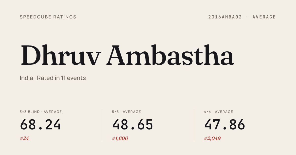 Mar 15, 20263x3x3 Blindfolded · Round 1BigNBlindBangaloreMarch2026 · 1st15.48Mar 15, 20263x3x3 Blindfolded · FinalBigNBlindBangaloreMarch2026 · 1st19.92Mar 15, 20264x4x4 Cube · FinalBigNBlindBangaloreMarch2026 · 5th40.41Mar 15, 20264x4x4 Cube · Round 1BigNBlindBangaloreMarch2026 · 5th37.11Mar 15, 20265x5x5 Cube · Combined FinalBigNBlindBangaloreMarch2026 · 5th1:08.07Mar 15, 20266x6x6 Cube · Combined FinalBigNBlindBangaloreMarch2026 · 16th2:16.33Mar 15, 20267x7x7 Cube · Combined FinalBigNBlindBangaloreMarch2026 · 15th4:26.79Mar 7, 20263x3x3 Cube · Round 1SaraswatiCollegeOpen2026 · 13th11.28Jan 18, 20262x2x2 Cube · FinalPravegaIIScBLRCubeOpen2026 · 20th4.95Jan 18, 20262x2x2 Cube · Round 1PravegaIIScBLRCubeOpen2026 · 19th4.62Jan 18, 20263x3x3 Cube · FinalPravegaIIScBLRCubeOpen2026 · 19th13.41Jan 18, 20263x3x3 Cube · Round 1PravegaIIScBLRCubeOpen2026 · 15th12.40Jan 18, 20263x3x3 Blindfolded · Round 1PravegaIIScBLRCubeOpen2026 · 1st21.80Jan 18, 20263x3x3 Blindfolded · FinalPravegaIIScBLRCubeOpen2026 · 1st17.14Jan 18, 20263x3x3 One-Handed · Round 1PravegaIIScBLRCubeOpen2026 · 15th23.82Jan 18, 20264x4x4 Cube · Round 1PravegaIIScBLRCubeOpen2026 · 9th40.04Jan 18, 20264x4x4 Cube · FinalPravegaIIScBLRCubeOpen2026 · 6th35.98Jan 18, 20265x5x5 Cube · Combined FinalPravegaIIScBLRCubeOpen2026 · 21st1:02.23Jan 18, 20266x6x6 Cube · Combined FinalPravegaIIScBLRCubeOpen2026 · 7th2:24.68