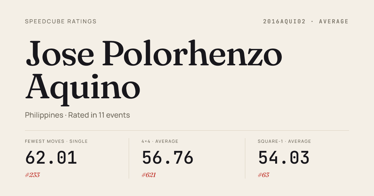 - Feb 28, 20263x3x3 Cube · FinalPinoySideEventsOpen2026 · 4th8.41