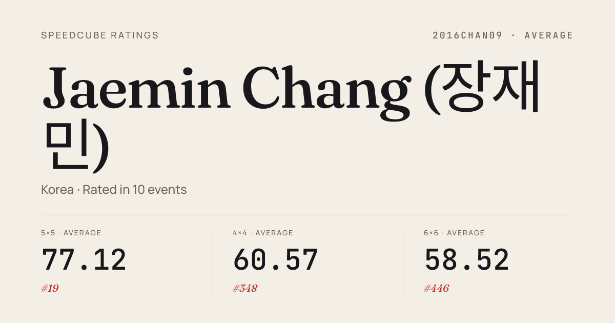 Dec 28, 20255x5x5 Cube · Round 1KoreanChampionship2025 · national · 3rd46.25Mar 8, 20252x2x2 Cube · FinalKoreaNewcomersPM2025 · 7th2.65Mar 8, 20253x3x3 Cube · FinalKoreaNewcomersPM2025 · 2nd6.71Mar 8, 20253x3x3 Cube · Round 1KoreaNewcomersPM2025 · 1st6.48Jan 19, 20252x2x2 Cube · Round 1HappySuseong2025 · 1st1.35Jan 19, 20252x2x2 Cube · Round 2HappySuseong2025 · 4th2.31Jan 19, 20252x2x2 Cube · FinalHappySuseong2025 · 1st1.57Jan 19, 20253x3x3 Cube · FinalHappySuseong2025 · 4th7.60Jan 19, 20253x3x3 Cube · Round 2HappySuseong2025 · 2nd7.00Jan 19, 20253x3x3 Cube · Round 1HappySuseong2025 · 3rd7.45Jan 19, 20254x4x4 Cube · FinalHappySuseong2025 · 3rd26.03Jan 19, 20254x4x4 Cube · Round 1HappySuseong2025 · 3rd26.42Jan 19, 20255x5x5 Cube · FinalHappySuseong2025 · 3rd44.98Jan 19, 20255x5x5 Cube · Round 1HappySuseong2025 · 2nd47.70Jan 19, 20255x5x5 Cube · Round 2HappySuseong2025 · 2nd43.37Jan 19, 2025Square-1 · FinalHappySuseong2025 · 3rd7.73Jan 19, 2025Square-1 · Round 2HappySuseong2025 · 3rd8.76Jan 19, 2025Square-1 · Round 1HappySuseong2025 · 1st7.40Dec 14, 20242x2x2 Cube · FinalSeoulWinter2024 · 2nd1.53Dec 14, 20242x2x2 Cube · Round 1SeoulWinter2024 · 3rd2.25