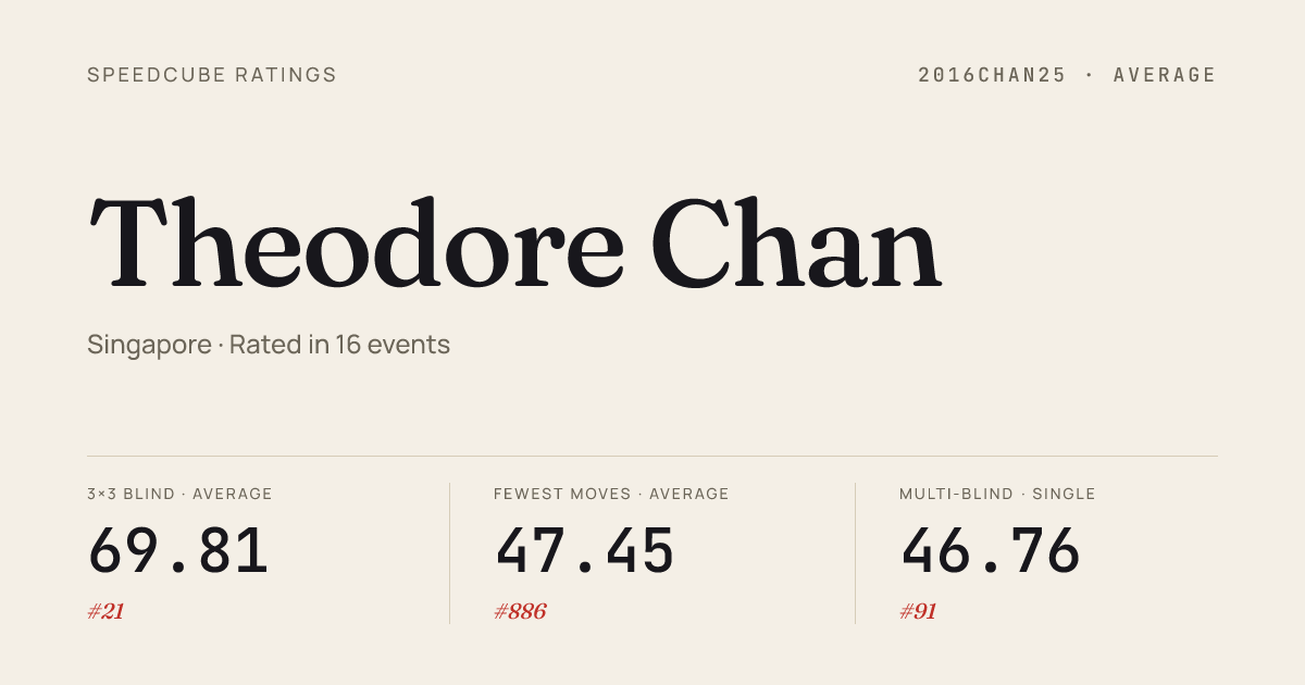 Apr 5, 20263x3x3 One-Handed · FinalMYHMUoSMFinalCubeOpen2026 · 12th19.83Apr 5, 20263x3x3 One-Handed · Round 1MYHMUoSMFinalCubeOpen2026 · 12th17.24Apr 5, 2026Clock · Round 1MYHMUoSMFinalCubeOpen2026 · 18th12.15Apr 5, 2026Megaminx · Round 1MYHMUoSMFinalCubeOpen2026 · 25th1:35.84Apr 5, 2026Square-1 · Round 1MYHMUoSMFinalCubeOpen2026 · 26th49.63Mar 15, 20263x3x3 Blindfolded · Round 1MidMarchSingapore2026 · 1st18.87Mar 15, 20263x3x3 Blindfolded · FinalMidMarchSingapore2026 · 1st18.51Feb 22, 20263x3x3 Blindfolded · Round 1SingaporeChampionship2026 · national · 1st16.22Feb 22, 20263x3x3 Blindfolded · FinalSingaporeChampionship2026 · national · 1st20.98Feb 22, 20263x3x3 Multi-Blind · FinalSingaporeChampionship2026 · national · 3rd26/30 in 49:35Feb 22, 20264x4x4 Blindfolded · FinalSingaporeChampionship2026 · national · 2nd2:23.71Feb 22, 20265x5x5 Blindfolded · FinalSingaporeChampionship2026 · national · 1st5:52.16Feb 7, 20262x2x2 Cube · FinalPhitsanulokBigSides2026 · 6th3.63Feb 7, 20262x2x2 Cube · Round 1PhitsanulokBigSides2026 · 6th3.77Feb 7, 20263x3x3 Cube · Round 1PhitsanulokBigSides2026 · 9th11.22Feb 7, 20263x3x3 Cube · Round 2PhitsanulokBigSides2026 · 9th11.01Feb 7, 20263x3x3 Blindfolded · FinalPhitsanulokBigSides2026 · 1st18.83Feb 7, 20263x3x3 Blindfolded · Round 1PhitsanulokBigSides2026 · 1st22.39Feb 7, 20263x3x3 One-Handed · Combined FinalPhitsanulokBigSides2026 · 5th18.98Feb 7, 20263x3x3 One-Handed · Round 1PhitsanulokBigSides2026 · 6th18.12