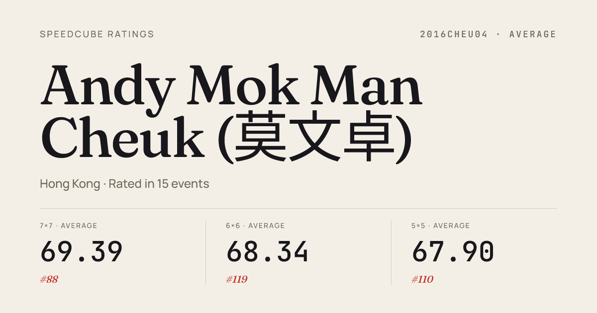 Mar 14, 20263x3x3 Cube · Round 1ZhuhaiPiDay2026 · 19th7.67Mar 14, 20263x3x3 Cube · FinalZhuhaiPiDay2026 · 15th7.28Mar 14, 20265x5x5 Cube · Round 1ZhuhaiPiDay2026 · 6th51.42Mar 14, 20265x5x5 Cube · FinalZhuhaiPiDay2026 · 7th51.02Mar 14, 20267x7x7 Cube · Combined FinalZhuhaiPiDay2026 · 4th2:19.60Mar 14, 2026Square-1 · Round 1ZhuhaiPiDay2026 · 6th11.76Mar 14, 2026Square-1 · FinalZhuhaiPiDay2026 · 14th17.13Mar 1, 20262x2x2 Cube · Round 1XMUMCubeOpen2026 · 3rd2.58Mar 1, 20262x2x2 Cube · FinalXMUMCubeOpen2026 · 4th2.33Mar 1, 20263x3x3 Cube · Round 2XMUMCubeOpen2026 · 2nd7.12Mar 1, 20263x3x3 Cube · Round 1XMUMCubeOpen2026 · 4th7.41Mar 1, 20263x3x3 Cube · FinalXMUMCubeOpen2026 · 6th8.80Mar 1, 20263x3x3 Blindfolded · FinalXMUMCubeOpen2026 · 13th1:56.65Mar 1, 20263x3x3 One-Handed · Round 1XMUMCubeOpen2026 · 2nd11.37Mar 1, 20263x3x3 One-Handed · FinalXMUMCubeOpen2026 · 3rd14.13Mar 1, 20264x4x4 Cube · Round 2XMUMCubeOpen2026 · 3rd27.72Mar 1, 20264x4x4 Cube · Round 1XMUMCubeOpen2026 · 4th27.45Mar 1, 20264x4x4 Cube · FinalXMUMCubeOpen2026 · 3rd27.96Mar 1, 20265x5x5 Cube · FinalXMUMCubeOpen2026 · 3rd50.50
