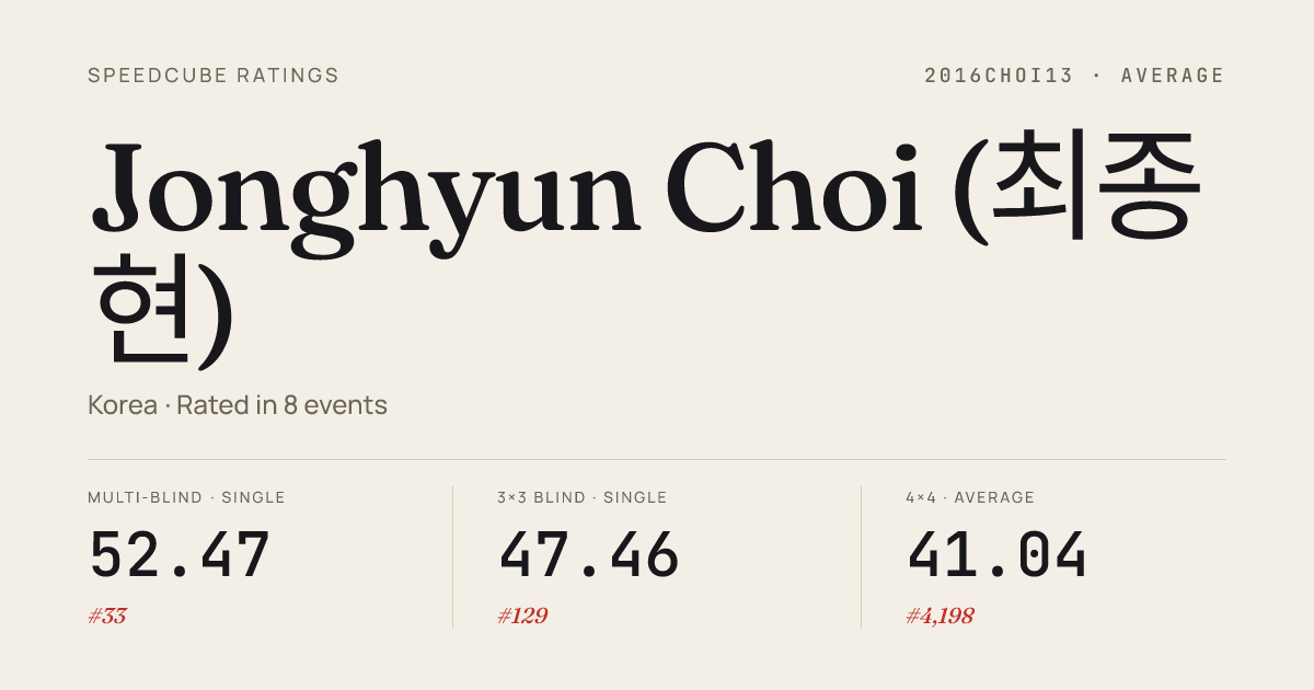 Dec 28, 20253x3x3 Blindfolded · Round 1KoreanChampionship2025 · national · 8th33.68Dec 28, 20253x3x3 Multi-Blind · FinalKoreanChampionship2025 · national · 3rd35/40 in 57:28Nov 15, 20252x2x2 Cube · Round 1UhseoOsong2025 · 20th3.66Nov 15, 20253x3x3 Cube · Round 1UhseoOsong2025 · 52nd12.97Nov 15, 20253x3x3 Blindfolded · FinalUhseoOsong2025 · 6th26.51Nov 15, 20253x3x3 Blindfolded · Round 1UhseoOsong2025 · 1st25.71Nov 15, 20253x3x3 One-Handed · Round 1UhseoOsong2025 · 30th21.80Oct 19, 20253x3x3 Blindfolded · FinalPleaseBeQuietTaiwan2025 · 1st25.14Oct 19, 20253x3x3 Blindfolded · Round 1PleaseBeQuietTaiwan2025 · 2nd24.69Oct 19, 20253x3x3 Blindfolded · Round 2PleaseBeQuietTaiwan2025 · 6th33.15Oct 19, 20253x3x3 Multi-Blind · FinalPleaseBeQuietTaiwan2025 · 4th26/40 in 60:02Oct 19, 20254x4x4 Blindfolded · Round 1PleaseBeQuietTaiwan2025 · 6th4:17.05Oct 19, 20254x4x4 Blindfolded · FinalPleaseBeQuietTaiwan2025 · 3rd3:53.57Aug 24, 20253x3x3 Multi-Blind · FinalSilentKoreaOpen2025 · 2nd29/33 in 56:30Aug 24, 20254x4x4 Blindfolded · Round 1SilentKoreaOpen2025 · 8th4:47.24Jul 13, 20253x3x3 Cube · Round 1SuwonSummer2025 · 66th13.26Jul 13, 20254x4x4 Cube · Round 1SuwonSummer2025 · 27th42.25Jul 13, 2025Pyraminx · Round 1SuwonSummer2025 · 110th23.66Jul 6, 20252x2x2 Cube · Round 1WC2025 · world · 1170th4.93