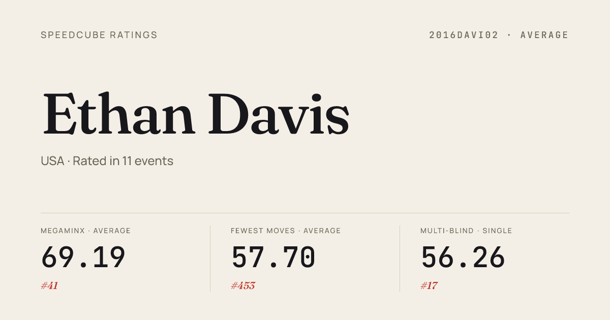 Aug 10, 20253x3x3 Cube · FinalCoffeeCupTacoma2025 · 11th9.84Aug 10, 20253x3x3 Blindfolded · FinalCoffeeCupTacoma2025 · 1st21.91Aug 10, 20253x3x3 Blindfolded · Round 1CoffeeCupTacoma2025 · 1st17.18Aug 10, 20253x3x3 One-Handed · FinalCoffeeCupTacoma2025 · 6th16.05Aug 10, 20253x3x3 One-Handed · Round 1CoffeeCupTacoma2025 · 3rd16.01Aug 10, 2025Megaminx · Round 1CoffeeCupTacoma2025 · 1st35.01Aug 10, 2025Megaminx · FinalCoffeeCupTacoma2025 · 1st34.85Jul 6, 20252x2x2 Cube · Round 1WC2025 · world · 474th3.36Jul 6, 20253x3x3 Cube · Round 1WC2025 · world · 708th10.21Jul 6, 20253x3x3 Blindfolded · Round 2WC2025 · world · 44th27.88Jul 6, 20253x3x3 Blindfolded · Round 1WC2025 · world · 50th28.57Jul 6, 20253x3x3 Multi-Blind · FinalWC2025 · world · 12th35/41 in 60:00Jul 6, 20253x3x3 One-Handed · Round 1WC2025 · world · 244th15.56Jul 6, 20254x4x4 Cube · Round 1WC2025 · world · 391st36.88Jul 6, 20254x4x4 Blindfolded · FinalWC2025 · world · 32nd4:14.87Jul 6, 20255x5x5 Cube · Round 1WC2025 · world · 273rd1:05.42Jul 6, 20257x7x7 Cube · Round 1WC2025 · world · 240th3:26.45Jul 6, 2025Megaminx · Round 1WC2025 · world · 17th33.66Jul 6, 2025Megaminx · FinalWC2025 · world · 16th33.71