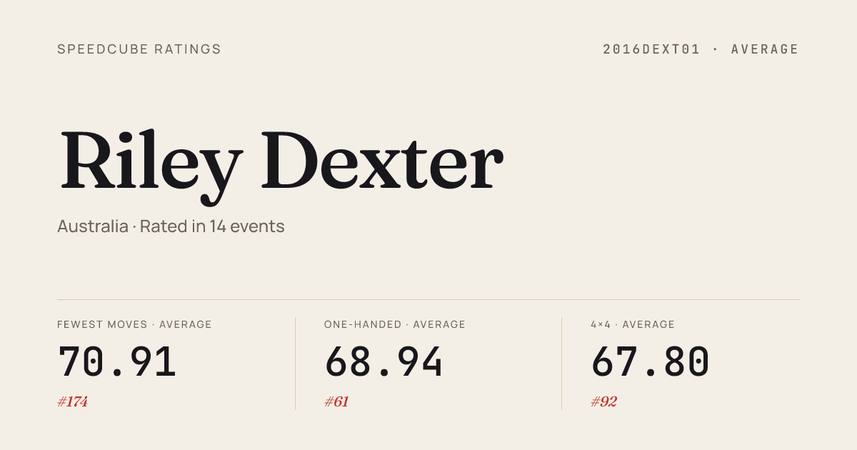 Apr 19, 20263x3x3 Cube · Round 2SolvinginSale2026 · 3rd6.73Apr 19, 20263x3x3 Blindfolded · FinalSolvinginSale2026 · 6th52.05Apr 19, 20263x3x3 Blindfolded · Round 1SolvinginSale2026 · 8th1:02.88Apr 19, 20263x3x3 Fewest Moves · FinalSolvinginSale2026 · 2nd27.00Apr 19, 20263x3x3 One-Handed · Combined FinalSolvinginSale2026 · 4th11.49Apr 19, 20264x4x4 Cube · Combined FinalSolvinginSale2026 · 5th29.59Apr 19, 20265x5x5 Cube · Combined FinalSolvinginSale2026 · 6th53.80Apr 19, 2026Megaminx · Combined FinalSolvinginSale2026 · 5th45.87Apr 19, 2026Pyraminx · Round 2SolvinginSale2026 · 5th3.09Apr 19, 2026Pyraminx · Round 1SolvinginSale2026 · 6th3.27Apr 19, 2026Pyraminx · FinalSolvinginSale2026 · 6th3.53Apr 19, 2026Skewb · FinalSolvinginSale2026 · 10th4.90Apr 19, 2026Skewb · Round 1SolvinginSale2026 · 13th5.27Apr 12, 20262x2x2 Cube · Round 1WestMelbourneOpen2026 · 13th2.43Apr 12, 20262x2x2 Cube · Round 2WestMelbourneOpen2026 · 4th1.98Apr 12, 20262x2x2 Cube · FinalWestMelbourneOpen2026 · 3rd1.51Apr 12, 20263x3x3 Cube · FinalWestMelbourneOpen2026 · 1st6.19Apr 12, 20263x3x3 Cube · Semi-FinalWestMelbourneOpen2026 · 2nd6.71Apr 12, 20263x3x3 Cube · Round 2WestMelbourneOpen2026 · 1st5.38