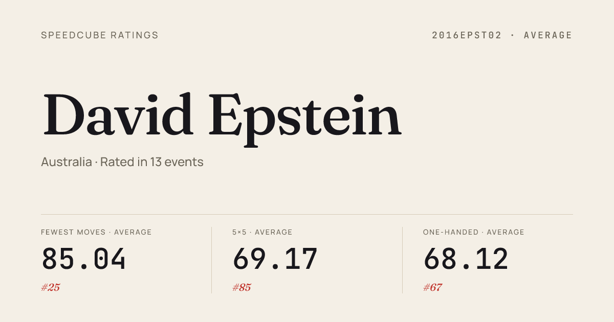 Apr 19, 20263x3x3 Cube · Round 2SolvinginSale2026 · 1st5.63Apr 19, 20263x3x3 One-Handed · Combined FinalSolvinginSale2026 · 1st10.11Apr 19, 20264x4x4 Cube · Combined FinalSolvinginSale2026 · 4th27.97Apr 19, 20265x5x5 Cube · Combined FinalSolvinginSale2026 · 3rd49.55Apr 19, 2026Megaminx · Combined FinalSolvinginSale2026 · 4th45.29Apr 19, 2026Pyraminx · Round 1SolvinginSale2026 · 20th6.31Apr 19, 2026Pyraminx · Round 2SolvinginSale2026 · 19th5.68Apr 12, 20262x2x2 Cube · Round 1WestMelbourneOpen2026 · 6th2.17Apr 12, 20262x2x2 Cube · Round 2WestMelbourneOpen2026 · 15th2.52Apr 12, 20262x2x2 Cube · FinalWestMelbourneOpen2026 · 4th1.57Apr 12, 20263x3x3 Cube · Round 1WestMelbourneOpen2026 · 2nd6.52Apr 12, 20263x3x3 Cube · Round 2WestMelbourneOpen2026 · 2nd6.35Apr 12, 20263x3x3 Cube · Semi-FinalWestMelbourneOpen2026 · 1st6.45Apr 12, 20263x3x3 Cube · FinalWestMelbourneOpen2026 · 2nd6.81Apr 12, 20264x4x4 Cube · Round 1WestMelbourneOpen2026 · 1st25.27Apr 12, 20264x4x4 Cube · FinalWestMelbourneOpen2026 · 3rd29.53Apr 12, 2026Square-1 · Combined FinalWestMelbourneOpen2026 · 1st6.62Mar 8, 20263x3x3 Cube · FinalNEMelbourneMarchSunday2026 · 1st6.38Mar 8, 20263x3x3 Cube · Round 1NEMelbourneMarchSunday2026 · 1st6.15