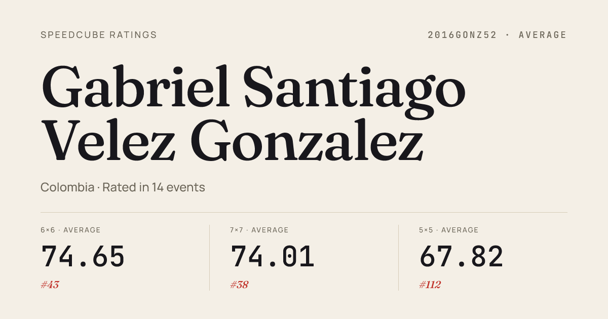 - Jan 7, 20267x7x7 Cube · Round 1PocosCuposBogotaXVIII2026 · 1st2:08.46