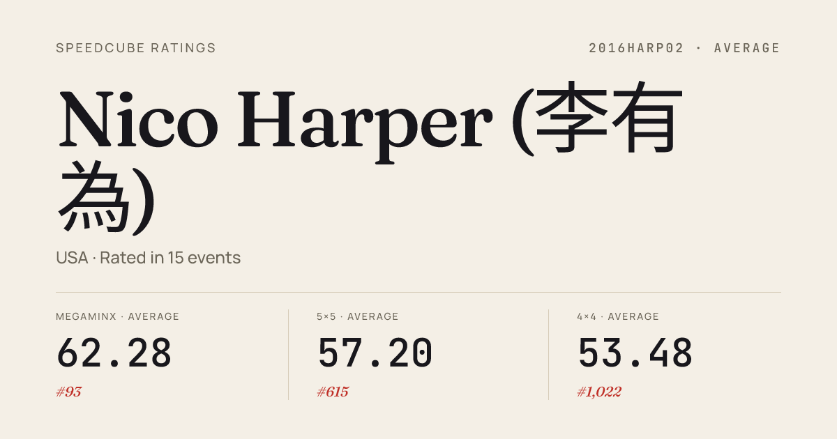 Oct 4, 20255x5x5 Cube · Combined FinalSeattleCubeCascadeUW2025 · 5th58.55Oct 4, 2025Square-1 · FinalSeattleCubeCascadeUW2025 · 4th11.16Oct 4, 2025Square-1 · Round 1SeattleCubeCascadeUW2025 · 3rd10.73Jul 6, 20252x2x2 Cube · Round 1WC2025 · world · 788th4.00Jul 6, 20253x3x3 Cube · Round 1WC2025 · world · 244th8.34Jul 6, 20253x3x3 Cube · Round 2WC2025 · world · 264th8.44Jul 6, 20253x3x3 One-Handed · Round 1WC2025 · world · 235th15.39Jul 6, 20254x4x4 Cube · Round 1WC2025 · world · 124th30.69Jul 6, 20255x5x5 Cube · Round 1WC2025 · world · 149th59.36Jul 6, 20257x7x7 Cube · Round 2WC2025 · world · 104th2:57.30Jul 6, 20257x7x7 Cube · Round 1WC2025 · world · 113th2:54.51Jul 6, 2025Clock · Round 1WC2025 · world · 461st9.12Jul 6, 2025Megaminx · Round 2WC2025 · world · 37th37.93Jul 6, 2025Megaminx · Round 1WC2025 · world · 34th37.20Jul 6, 2025Pyraminx · Round 1WC2025 · world · 797th7.18Jul 6, 2025Skewb · Round 1WC2025 · world · 537th6.57Jul 6, 2025Square-1 · Round 1WC2025 · world · 50th9.28Jul 6, 2025Square-1 · Round 2WC2025 · world · 52nd9.64Jun 25, 20252x2x2 Cube · Round 1WCCTBerkeley2025 · 4th2.40