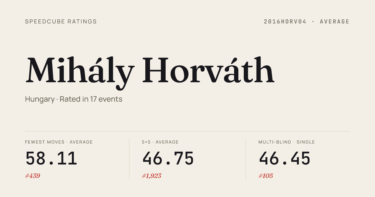 Nov 2, 20255x5x5 Cube · FinalHungarianOpen2025 · national · 13th1:15.61Nov 2, 20255x5x5 Cube · Round 1HungarianOpen2025 · national · 16th1:11.58Nov 2, 2025Megaminx · FinalHungarianOpen2025 · national · 11th1:01.39Nov 2, 2025Megaminx · Round 1HungarianOpen2025 · national · 12th1:04.41Jul 12, 20253x3x3 Blindfolded · FinalHungarianAllRounder72025 · 2nd37.45Jul 12, 20253x3x3 Fewest Moves · FinalHungarianAllRounder72025 · 4th32.67Jul 12, 20253x3x3 Multi-Blind · FinalHungarianAllRounder72025 · 1st16/16 in 59:01Jul 12, 20254x4x4 Blindfolded · FinalHungarianAllRounder72025 · 1st4:20.35Jul 12, 20255x5x5 Blindfolded · FinalHungarianAllRounder72025 · 1st10:17.00Feb 8, 20253x3x3 Blindfolded · FinalHungarianAllRounder2Frozen2025 · 1st29.61Feb 8, 20253x3x3 Fewest Moves · FinalHungarianAllRounder2Frozen2025 · 5th34.33Feb 8, 20253x3x3 Multi-Blind · FinalHungarianAllRounder2Frozen2025 · 2nd15/15 in 58:07Feb 8, 20254x4x4 Blindfolded · FinalHungarianAllRounder2Frozen2025 · 1st3:26.50Feb 8, 20255x5x5 Blindfolded · FinalHungarianAllRounder2Frozen2025 · 1st9:26.83Dec 7, 20242x2x2 Cube · Round 1HungarianAllRounder102024 · 13th3.84Dec 7, 20242x2x2 Cube · FinalHungarianAllRounder102024 · 15th4.58Dec 7, 20243x3x3 Cube · FinalHungarianAllRounder102024 · 8th9.61Dec 7, 20243x3x3 Cube · Round 1HungarianAllRounder102024 · 9th9.76Dec 7, 20243x3x3 One-Handed · Combined FinalHungarianAllRounder102024 · 6th17.91Dec 7, 20244x4x4 Cube · Combined FinalHungarianAllRounder102024 · 8th41.16