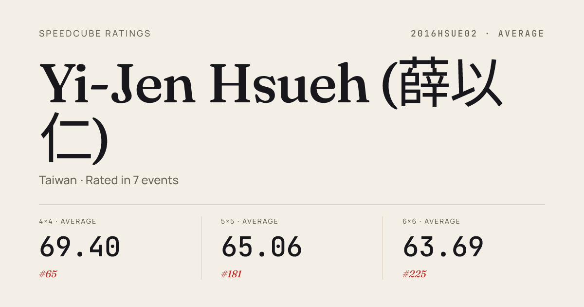 Dec 21, 20254x4x4 Cube · FinalTaiwanChampionship2025 · 5th26.54Dec 21, 20254x4x4 Cube · Round 2TaiwanChampionship2025 · 5th25.68Dec 21, 20254x4x4 Cube · Round 1TaiwanChampionship2025 · 4th25.28Dec 21, 20255x5x5 Cube · Round 2TaiwanChampionship2025 · 9th50.55Dec 21, 20255x5x5 Cube · Round 1TaiwanChampionship2025 · 9th50.61Dec 21, 20255x5x5 Cube · FinalTaiwanChampionship2025 · 9th53.41Dec 21, 20256x6x6 Cube · FinalTaiwanChampionship2025 · 12th1:45.05Dec 21, 20256x6x6 Cube · Round 1TaiwanChampionship2025 · 11th1:36.12Dec 21, 2025Megaminx · Round 1TaiwanChampionship2025 · 3rd41.34Dec 21, 2025Megaminx · FinalTaiwanChampionship2025 · 4th42.50Dec 14, 20253x3x3 Cube · Round 2ShinKongCubeOpenKaohsiung2025 · 8th8.25Dec 14, 20253x3x3 Cube · Round 1ShinKongCubeOpenKaohsiung2025 · 3rd7.90Dec 14, 20253x3x3 Cube · FinalShinKongCubeOpenKaohsiung2025 · 12th9.08Nov 30, 20253x3x3 Cube · Round 2TaoyuanAirportCubeDay2025 · 4th8.18Nov 30, 20253x3x3 Cube · Round 1TaoyuanAirportCubeDay2025 · 11th8.36Nov 30, 20253x3x3 Cube · FinalTaoyuanAirportCubeDay2025 · 4th7.98Nov 30, 20254x4x4 Cube · Round 1TaoyuanAirportCubeDay2025 · 3rd27.53Nov 30, 20254x4x4 Cube · FinalTaoyuanAirportCubeDay2025 · 3rd27.43Nov 30, 20254x4x4 Cube · Round 2TaoyuanAirportCubeDay2025 · 1st26.64Nov 30, 20255x5x5 Cube · FinalTaoyuanAirportCubeDay2025 · 5th52.45