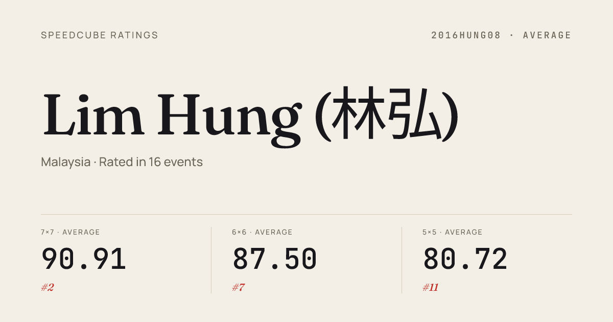 Apr 12, 20263x3x3 One-Handed · Combined FinalUSMPenangCube2026 · 2nd13.48Apr 12, 20264x4x4 Cube · Combined FinalUSMPenangCube2026 · 1st27.13Apr 12, 20265x5x5 Cube · Combined FinalUSMPenangCube2026 · 1st41.71Apr 12, 20266x6x6 Cube · Combined FinalUSMPenangCube2026 · 1st1:12.94Apr 12, 20267x7x7 Cube · Combined FinalUSMPenangCube2026 · 1st1:50.63Apr 12, 2026Clock · Combined FinalUSMPenangCube2026 · 4th9.14Apr 12, 2026Megaminx · Combined FinalUSMPenangCube2026 · 1st44.87Apr 12, 2026Pyraminx · Combined FinalUSMPenangCube2026 · 9th6.00Apr 12, 2026Pyraminx · Round 1USMPenangCube2026 · 7th5.74Apr 12, 2026Skewb · Round 1USMPenangCube2026 · 2nd3.72Apr 12, 2026Skewb · Combined FinalUSMPenangCube2026 · 2nd3.90Apr 5, 20262x2x2 Cube · Round 1MYHMUoSMFinalCubeOpen2026 · 5th2.31Apr 5, 20262x2x2 Cube · Round 2MYHMUoSMFinalCubeOpen2026 · 10th3.01Apr 5, 20262x2x2 Cube · FinalMYHMUoSMFinalCubeOpen2026 · 14th3.52Apr 5, 20263x3x3 Cube · FinalMYHMUoSMFinalCubeOpen2026 · 4th7.48Apr 5, 20263x3x3 Cube · Round 2MYHMUoSMFinalCubeOpen2026 · 4th7.44Apr 5, 20263x3x3 Cube · Round 1MYHMUoSMFinalCubeOpen2026 · 1st6.94Apr 5, 20263x3x3 One-Handed · Round 1MYHMUoSMFinalCubeOpen2026 · 5th14.15Apr 5, 20263x3x3 One-Handed · FinalMYHMUoSMFinalCubeOpen2026 · 9th17.24